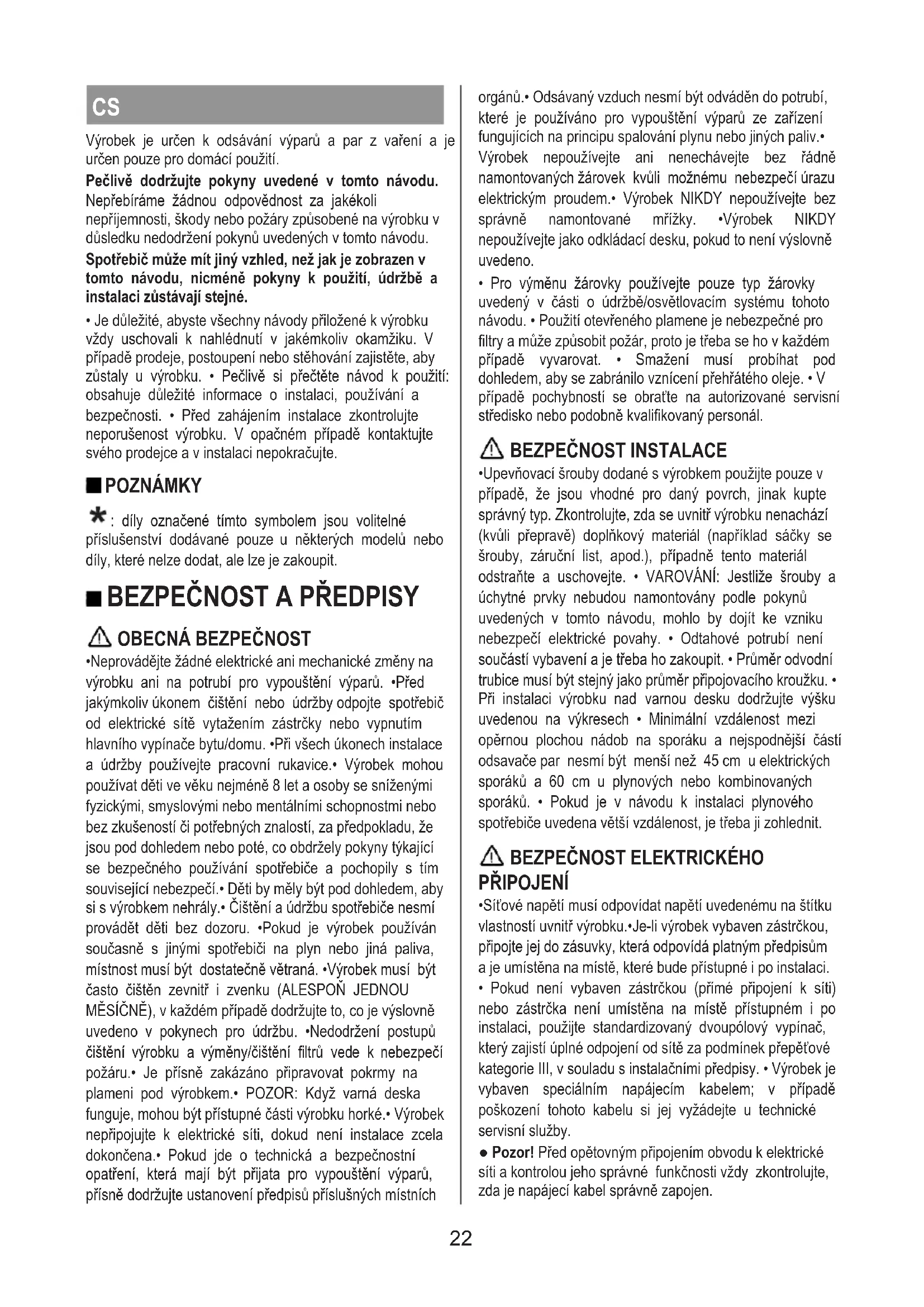 - Neprovádějte žádné elektrické ani mechanické změny na výrobku ani na potrubí pro vypouštění výparů. •Před jakýmkoliv úkonem čištění nebo údržby odpojte spotřebič od elektrické sítě vytažením zástrčky nebo vypnutím hlavního vypínače bytu/domu. •Při všech úkonech instalace a údržby používejte pracovní rukavice.• Výrobek mohou používat děti ve věku nejméně 8 let a osoby se sníženými fyzickými, smyslovými nebo mentálními schopnostmi nebo bez zkušeností či potřebných znalostí, za předpokladu, že jsou pod dohledem nebo poté, co obdržely pokyny týkající se bezpečného používání spotřebiče a pochopily s tím související nebezpečí.• Děti by měly být pod dohledem, aby si s výrobkem nehrály.• Čištění a údržbu spotřebiče nesmí provádět děti bez dozoru. •Pokud je výrobek používán současně s jinými spotřebiči na plyn nebo jiná paliva, místnost musí být dostatečně větraná. •Výrobek musí být často čištěn zevnitř i zvenku (ALESPOŇ JEDNOU MĚSÍČNĚ), v každém případě dodržujte to, co je výslovně uvedeno v pokynech pro údržbu. •Nedodržení postupů čištění výrobku a výměny/čištění filtrů vede k nebezpečí požáru.• Je přísně zakázáno připravovat pokrmy na plameni pod výrobkem.• POZOR: Když varná deska funguje, mohou být přístupné části výrobku horké.• Výrobek nepřipojujte k elektrické síti, dokud není instalace zcela dokončena.• Pokud jde o technická a bezpečnostní opatření, která mají být přijata pro vypouštění výparů, přísně dodržujte ustanovení předpisů příslušných místních orgánů.• Odsávaný vzduch nesmí být odváděn do potrubí, které je používáno pro vypouštění výparů ze zařízení fungujících na principu spalování plynu nebo jiných paliv.• Výrobek nepoužívejte ani nenechávejte bez řádně namontovaných žárovek kvůli možnému nebezpečí úrazu elektrickým proudem.• Výrobek NIKDY nepoužívejte bez správně namontované mřížky. •Výrobek NIKDY nepoužívejte jako odkládací desku, pokud to není výslovně uvedeno.