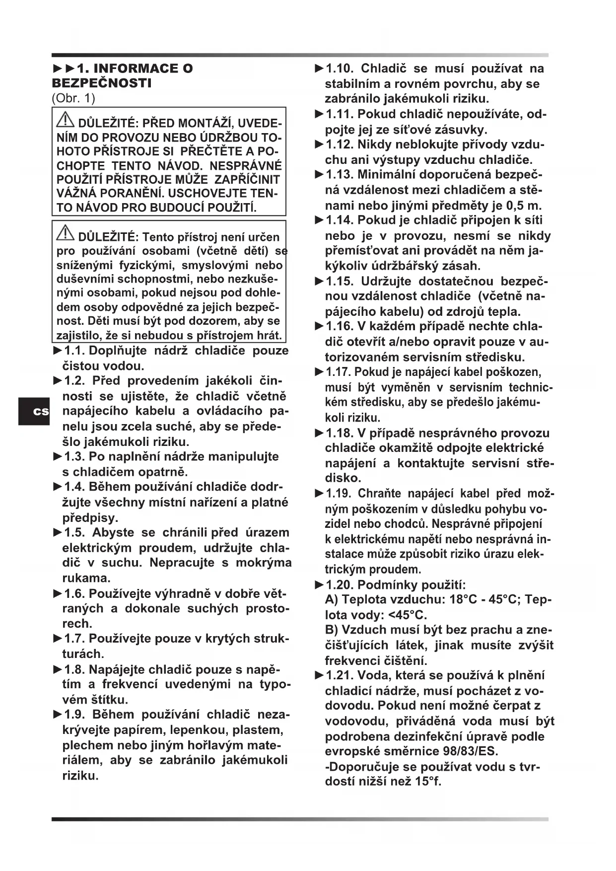 1.19. Chraňte napájecí kabel před mož- ným poškozením v důsledku pohybu vo- zidel nebo chodců. Nesprávné připojení k elektrickému napětí nebo nesprávná in- stalace může způsobit riziko úrazu elek- trickým proudem. ►1.20. Podmínky použití: A) Teplota vzduchu: 18°C - 45°C; Tep- lota vody: <45°C. B) Vzduch musí být bez prachu a zne- čišťujících látek, jinak musíte zvýšit frekvenci čištění. ►1.21. Voda, která se používá k plnění chladicí nádrže, musí pocházet z vo- dovodu. Pokud není možné čerpat z vodovodu, přiváděná voda musí být podrobena dezinfekční úpravě podle evropské směrnice 98/83/ES. -Doporučuje se používat vodu s tvr- dostí nižší než 15°f.cs