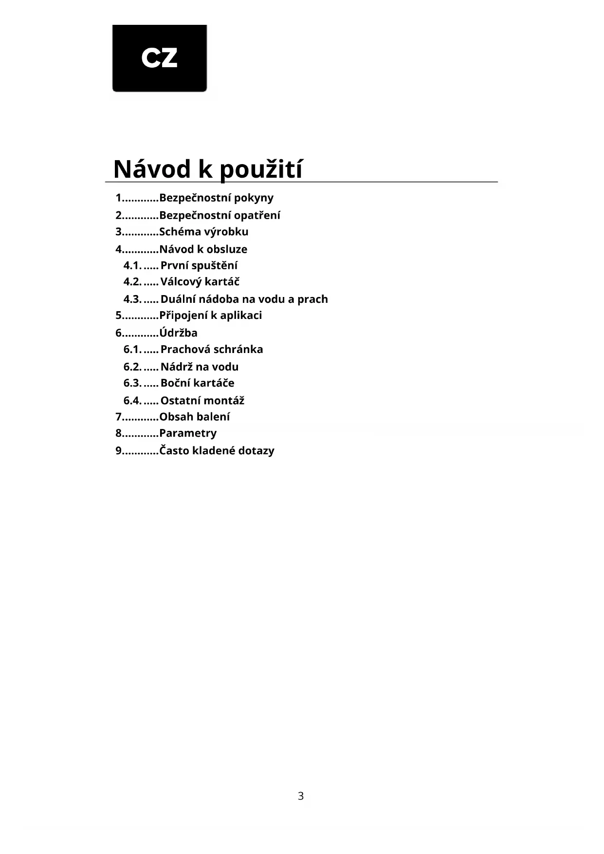 4.1. ..... První spuštění 4.2. ..... Válcový kartáč 4.3. ..... Duální nádoba na vodu a prach