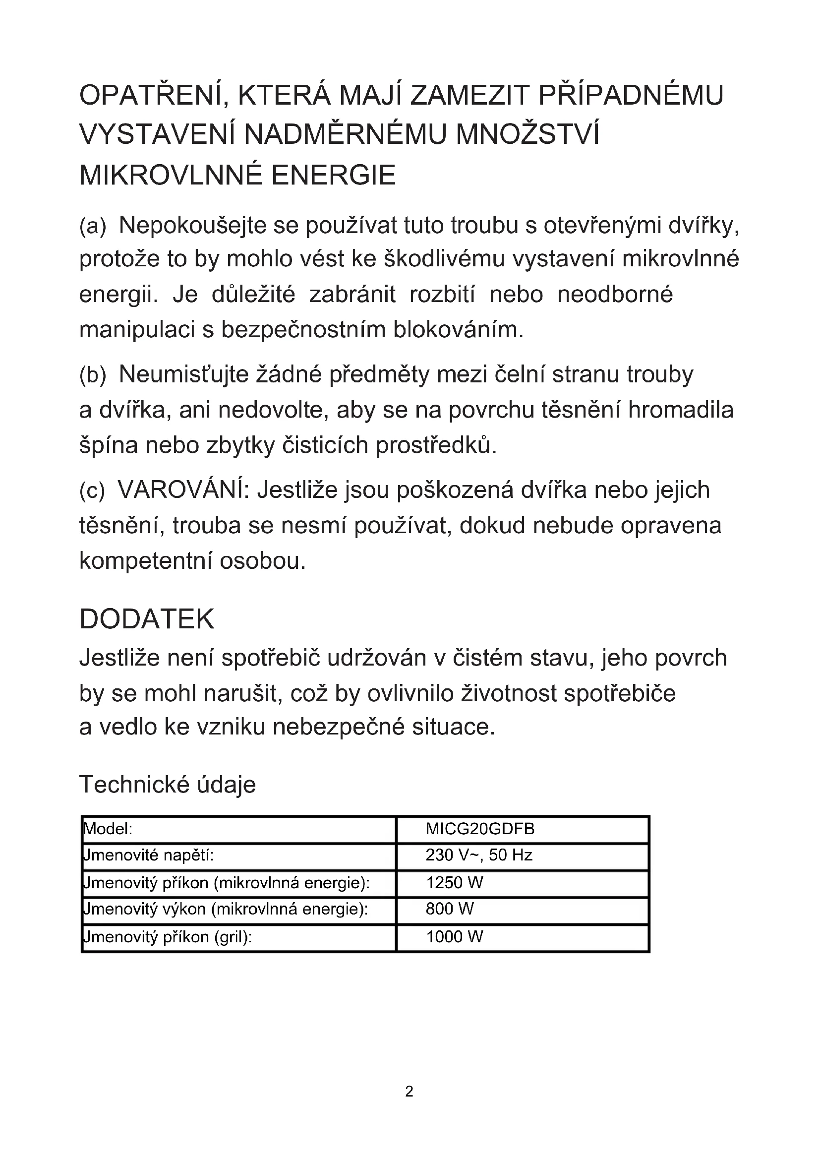 MIKROVLNNÉ ENERGIE (a) Nepokoušejte se používat tuto troubu s otevřenými dvířky, protože to by mohlo vést ke škodlivému vystavení mikrovlnné energii. Je důležité zabránit rozbití nebo neodborné manipulaci s bezpečnostním blokováním. (b) Neumisťujte žádné předměty mezi čelní stranu trouby a dvířka, ani nedovolte, aby se na povrchu těsnění hromadila špína nebo zbytky čisticích prostředků. (c) VAROVÁNÍ: Jestliže jsou poškozená dvířka nebo jejich těsnění, trouba se nesmí používat, dokud nebude opravena kompetentní osobou. DODATEK Jestliže není spotřebič udržován v čistém stavu, jeho povrch by se mohl narušit, což by ovlivnilo životnost spotřebiče a vedlo ke vzniku nebezpečné situace. Technické údaje Model: MICG20GDFB Jmenovité napětí: 230 V~, 50 Hz Jmenovitý příkon (mikrovlnná energie): 1250 W Jmenovitý výkon (mikrovlnná energie): 800 W Jmenovitý příkon (gril): 1000 W3