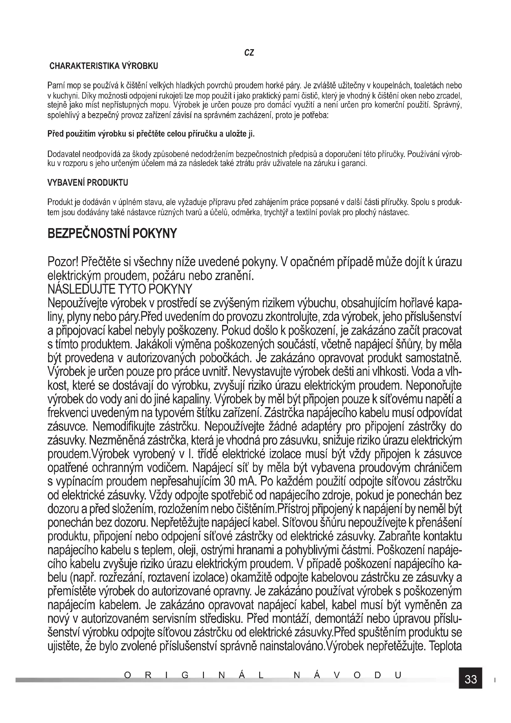 Parní mop se používá k čištění velkých hladkých povrchů proudem horké páry. Je zvláště užitečny v koupelnách, toaletách nebo v kuchyni. Díky možnosti odpojení rukojeti lze mop použít i jako praktický parní čistič, který je vhodný k čištění oken nebo zrcadel, stejně jako míst nepřístupných mopu. Výrobek je určen pouze pro domácí využití a není určen pro komerční použití. Správný, spolehlivý a bezpečný provoz zařízení závisí na správném zacházení, proto je potřeba: Před použitím výrobku si přečtěte celou příručku a uložte ji. Dodavatel neodpovídá za škody způsobené nedodržením bezpečnostních předpisů a doporučení této příručky. Používání výrob- ku v rozporu s jeho určeným účelem má za následek také ztrátu práv uživatele na záruku i garanci. VYBAVENÍ PRODUKTU Produkt je dodáván v úplném stavu, ale vyžaduje přípravu před zahájením práce popsané v další části příručky. Spolu s produk- tem jsou dodávány také nástavce různých tvarů a účelů, odměrka, trychtýř a textilní povlak pro plochý nástavec.