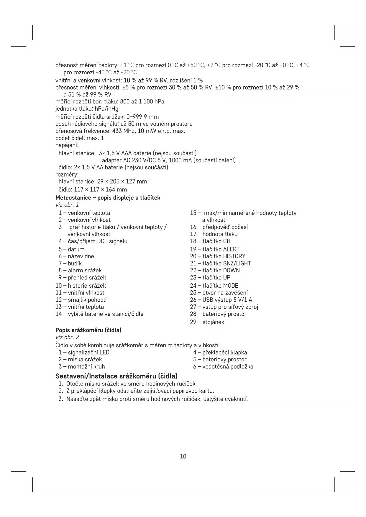 - This device is not intended for use by persons (including children) whose physical, sensory or mental disability or whose lack of experience or knowledge prevents them from using it safely. Such persons should be instructed in how to use the device and should be supervised by a person responsible for their safety. Do not dispose with domestic waste. Use special collection points for sorted waste. Contact local authorities for information about collection points. If the electronic devices would be disposed on landll, dangerous substances may reach groundwater and subsequently food chain, where it could aect human health. Hereby, EMOS spol. s r. o. declares that the radio equipment type E8670 is in compliance with Directive 2014/53/EU. The full text of the EU declaration of conformity is available at the following internet address: http://www.emos.eu/download. CZ | Bezdrátová meteostanice Než začněte s výrobkem pracovat, pečlivě si pročtěte tento návod. Specikace hodiny řízené rádiovým signálem formát času: 12/24 h vnitřní teplota: -10°C až +50°C, rozlišení 0,1°C venkovní teplota: -30°C až +60°C, rozlišení 0,1°C10 přesnost měření teploty: ±1°C pro rozmezí 0°C až +50°C, ±2°C pro rozmezí -20°C až +0°C, ±4°C pro rozmezí -40°C až -20°C vnitřní a venkovní vlhkost: 10% až 99% RV, rozlišení 1% přesnost měření vlhkosti: ±5% pro rozmezí 30% až 50% RV, ±10% pro rozmezí 10% až 29% a 51% až 99% RV měřicí rozpětí bar. tlaku: 800 až 1 100 hPa jednotka tlaku: hPa/inHg měřicí rozpětí čidla srážek: 0–999,9 mm dosah rádiového signálu: až 50 m ve volném prostoru přenosová frekvence: 433 MHz, 10 mW e.r.p. max. počet čidel: max. 1 napájení: hlavní stanice: 3× 1,5 V AAA baterie (nejsou součástí) adaptér AC 230 V/DC 5 V, 1000 mA (součástí balení) čidlo: 2× 1,5 V AA baterie (nejsou součástí) rozměry: hlavní stanice: 29 × 205 × 127 mm čidlo: 117 × 117 × 164 mm Meteostanice – popis displeje a tlačítek viz obr. 1 1 – venkovní teplota 2 – venkovní vlhkost 3 – graf historie tlaku / venkovní teploty / venkovní vlhkosti 4 – čas/příjem DCF signálu 5 – datum 6 – název dne 7 – budík 8 – alarm srážek 9 – přehled srážek 10 – historie srážek 11 – vnitřní vlhkost 12 – smajlík pohodlí 13 – vnitřní teplota 14 – vybité baterie ve stanici/čidle 15 – max/min naměřené hodnoty teploty a vlhkosti 16 – předpověď počasí 17 – hodnota tlaku 18 – tlačítko CH 19 – tlačítko ALERT 20 – tlačítko HISTORY 21 – tlačítko SNZ/LIGHT 22 – tlačítko DOWN 23 – tlačítko UP 24 – tlačítko MODE 25 – otvor na zavěšení 26 – USB výstup 5 V/1 A 27 – vstup pro síťový zdroj 28 – bateriový prostor 29 – stojánek Popis srážkoměru (čidla) viz obr. 2 Čidlo v sobě kombinuje srážkoměr s měřením teploty a vlhkosti. 1 – signalizační LED 2 – miska srážek 3 – montážní kruh 4 – překlápěcí klapka 5 – bateriový prostor 6 – vodotěsná podložka Sestavení/Instalace srážkoměru (čidla)