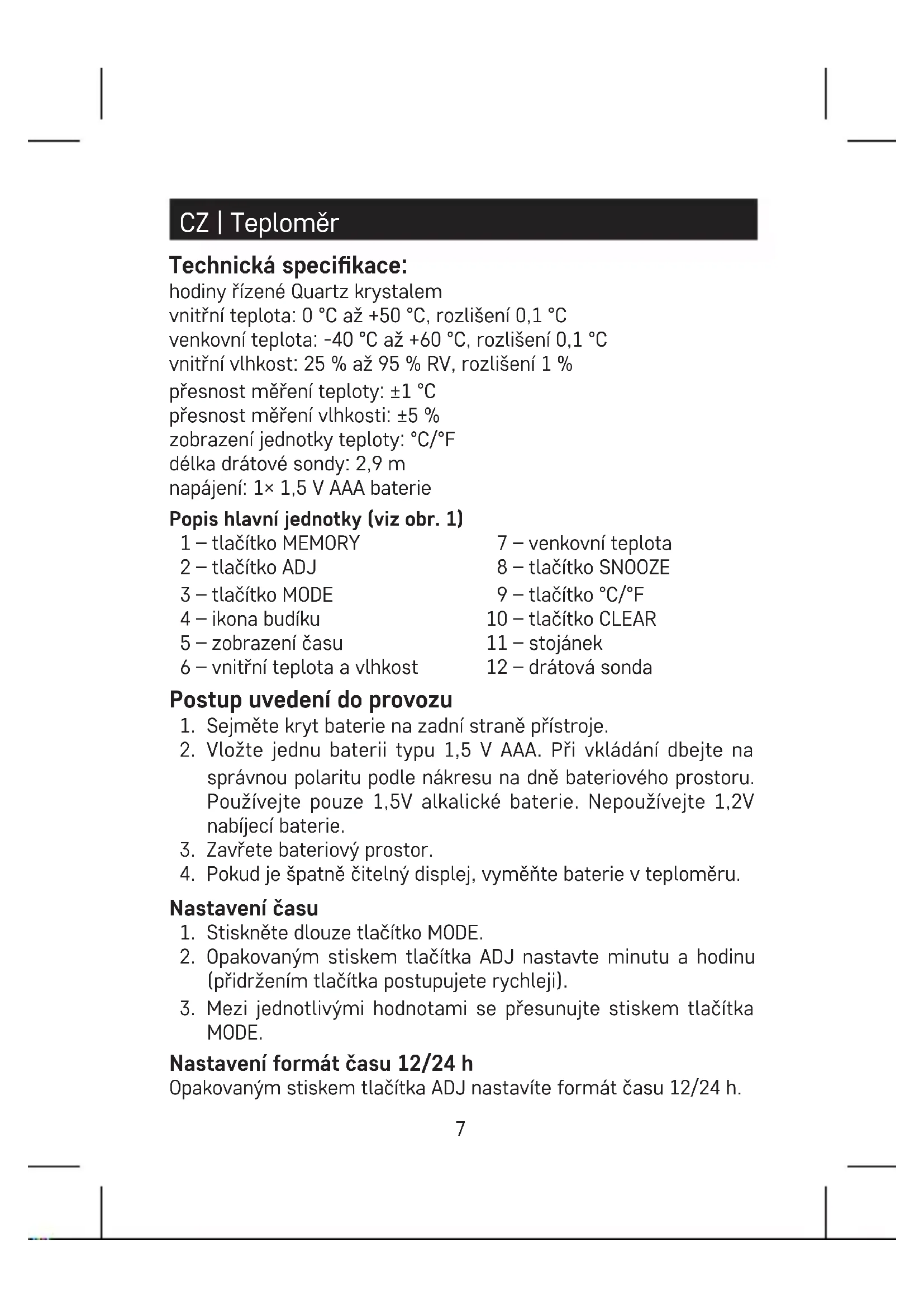 - This device is not intended for use by persons (including children) whose physical, sensory or mental disability or lack of experi- ence and expertise prevents them from safely using the device, if they are not supervised or if they have not been instructed regarding the use of this appliance by a person responsible for their safety. Do not dispose with domestic waste. Use special collection points for sorted waste. Contact local authorities for information about collection points. If the electronic devices would be disposed on landll, dangerous substances may reach groundwater and subsequently food chain, where it could aect human health.7 CZ | Teploměr Technická specikace: hodiny řízené Quartz krystalem vnitřní teplota: 0 °C až +50 °C, rozlišení 0,1 °C venkovní teplota: -40 °C až +60 °C, rozlišení 0,1 °C vnitřní vlhkost: 25 % až 95 % RV, rozlišení 1 % přesnost měření teploty: ±1 °C přesnost měření vlhkosti: ±5 % zobrazení jednotky teploty: °C/°F délka drátové sondy: 2,9 m napájení: 1× 1,5 V AAA baterie Popis hlavní jednotky (viz obr. 1) 1 – tlačítko MEMORY 2 – tlačítko ADJ 3 – tlačítko MODE 4 – ikona budíku 5 – zobrazení času 6 – vnitřní teplota a vlhkost 7 – venkovní teplota 8 – tlačítko SNOOZE 9 – tlačítko °C/°F 10 – tlačítko CLEAR 11 – stojánek 12 – drátová sonda Postup uvedení do provozu