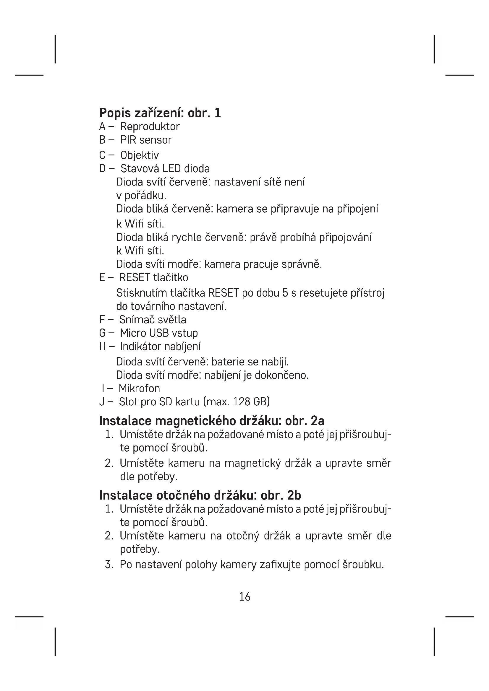 Instalace aplikace EMOS GoSmart: obr. 3 Aplikace je k dispozici pro Adroid a iOS prostřednictvím Google play a App Store. Ke stažení aplikace prosím naskenujte příslušný QR kód. Nastavení routeru: obr. 4 Kamera podporuje pouze 2,4 GHz Wi (nepodporuje 5 GHz). Mobilní aplikace EMOS GoSmart: Obr. 5a Otevřete aplikaci EMOS GoSmart a potvrďte zásady ochrany osobních údajů a klikněte na souhlasím. Obr. 5b Vyberte možnost registrace. Obr. 5c Zadejte název platné emailové adresy a zvolte heslo. Potvrďte souhlas se zásadami ochrany osobních údajů. Zvolte registrovat. Obr. 6a Vyberte možnost přidat zařízení. Obr. 6b Zvolte danou kategorii produktů. Obr. 6c Zvolte daný typ produktu. Obr. 6d Zapněte zařízení do el. sítě. Obr. 6e Ujistěte se, že LED dioda na zařízení bliká. Potvrďte tlačítkem další. Obr. 6f Zadejte název Wi sítě a heslo. Potvrďte tlačítkem další. Obr. 6g Na displeji Vašeho mobilního zařízení se objeví QR kód.18 QR kód umístěte před objektiv kamerové jednotky. Potvrďte, že jste slyšeli zvukový signál pro úspěšné spárování. Obr. 6h Proběhne automatické vyhledání zařízení. Obr. 6i Zařízení je vyhledáno. Potvrďte tlačítkem hotovo. Konektivita: Wi-Fi 2,4 GHz IEEE 802.11b/g/n Kmitočtové pásmo: 2,400–2,4835 GHz Tímto EMOS spol. s r.o. prohlašuje, že typ rádiového zařízení H4053 je v souladu se směrnicí 2014/53/EU. Úplné znění EU prohlášení o shodě je k dispozici na těchto internetových stránkách http://www.emos.eu/download. Nevyhazujte elektrické spotřebiče jako netříděný ko- munální odpad, použijte sběrná místa tříděného odpa- du. Pro aktuální informace o sběrných místech kontak- tujte místní úřady. Pokud jsou elektrické spotřebiče uložené na skládkách odpadků, nebezpečné látky mohou prosakovat do podzemní vody a dostat se do potravního ře- tězce a poškozovat vaše zdraví. SK | IP Kamera Obsah balení: Kamerová jednotka / Napájací adaptér / USB kábel / Magnetic- ký držiak / Otočný držiak / Sada skrutiek / Manuál Technická špecikácia: Napájanie: DC 5 V/1 A Rozmery: 58 × 58 × 94 mm Čistá hmotnosť: 225 g19 Rozlíšenie: 1 920 × 1 080 Senzor: 1/2,9‘‘ 2 Megapixel CMOS Kapacita batérie: 9 600 mAh Rozsah detekcie PIR: 9 m PIR uhol: 120° Objektív: 3,2 mm, F2,0 Úložisko: SD card (max. 128 GB), Cloud storage Stupeň krytia: IP65 APP: EMOS GoSmart for Android and iOS Pripojenie: 2,4 GHz WIFI (IEEE802.11b/g/n) Maximálny počet užívateľov: 4 Popis zariadenia: obr. 1 A – Reproduktor B – PIR sensor C – Objektív D – Stavová LED dióda Dióda svieti na červeno: nastavenie siete nie je v poriadku. Dióda bliká na červeno: kamera sa pripravuje na pripo- jenie k Wi sieti. Dióda bliká rýchlo na červeno: práve prebieha pripojova- nie k Wi sieti. Dióda svieti na modro: kamera pracuje správne. E – RESET tlačidlo Stlačením tlačidla RESET po dobu 5 s resetujete prístroj do továrenského nastavenia. F – Snímač svetla G – Micro USB vstup H – Indikátor nabíjania Dióda svieti na červeno: batéria sa nabíja. Dióda svieti na modro: nabíjanie je dokončené. I – Mikrofón J – Slot pre SD kartu (max. 128 GB)20 Inštalácia magnetického držiaku: obr. 2a