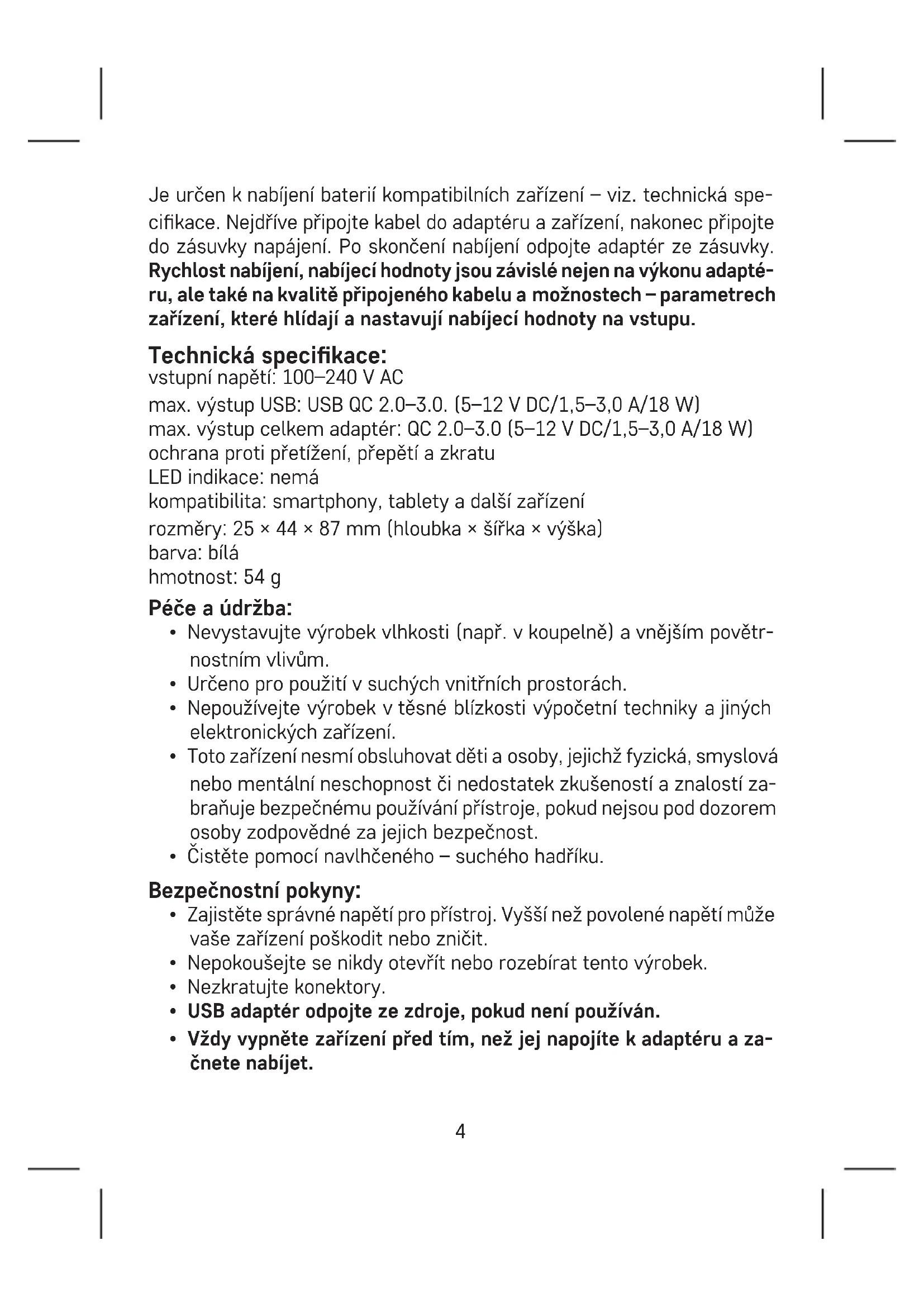 - Prevent improper handling of the device and always observe the principles of using electrical appliances. Do not dispose with domestic waste. Use special collection points for sorted waste. Contact local authorities for information about collection points. If the electronic devices would be disposed on land ll, dangerous substanoes may reach groundwater and subsequent- ly food chain, where it could aect human health. CZ | USB adaptér do sítě QUICK Návod k použití: Před použitím si, prosím, pozorně přečtěte návod kobsluze adodržujte pokyny. Popis amožnosti: Nabíjecí adaptér řady – QUICK QUICK = parametry USB výstupu (V; A; W) se nastaví podle připojených zařízení až do maximálních hodnot adaptéru anavíc umožňují quick nabíjení = rychlejší nabíjení zařízení až o50 % při výstupním napětí (3,6–12 VDC) – platí pouze prokompatibilní zařízení, např. sprocesory Qualcomm 2.0–3.0.4 Je určen knabíjení baterií kompatibilních zařízení – viz. technická spe- cikace. Nejdříve připojte kabel do adaptéru azařízení, nakonec připojte do zásuvky napájení. Po skončení nabíjení odpojte adaptér ze zásuvky. Rychlost nabíjení, nabíjecí hodnoty jsou závislé nejen na výkonu adapté- ru, ale také na kvalitě připojeného kabelu amožnostech – parametrech zařízení, které hlídají anastavují nabíjecí hodnoty na vstupu. Technická specikace: vstupní napětí: 100–240 VAC max. výstup USB: USB QC 2.0–3.0. (5–12 VDC/1,5–3,0 A/18 W) max. výstup celkem adaptér: QC 2.0–3.0 (5–12 VDC/1,5–3,0 A/18 W) ochrana proti přetížení, přepětí azkratu LED indikace: nemá kompatibilita: smartphony, tablety adalší zařízení rozměry: 25 × 44 × 87 mm (hloubka × šířka × výška) barva: bílá hmotnost: 54 g Péče aúdržba: