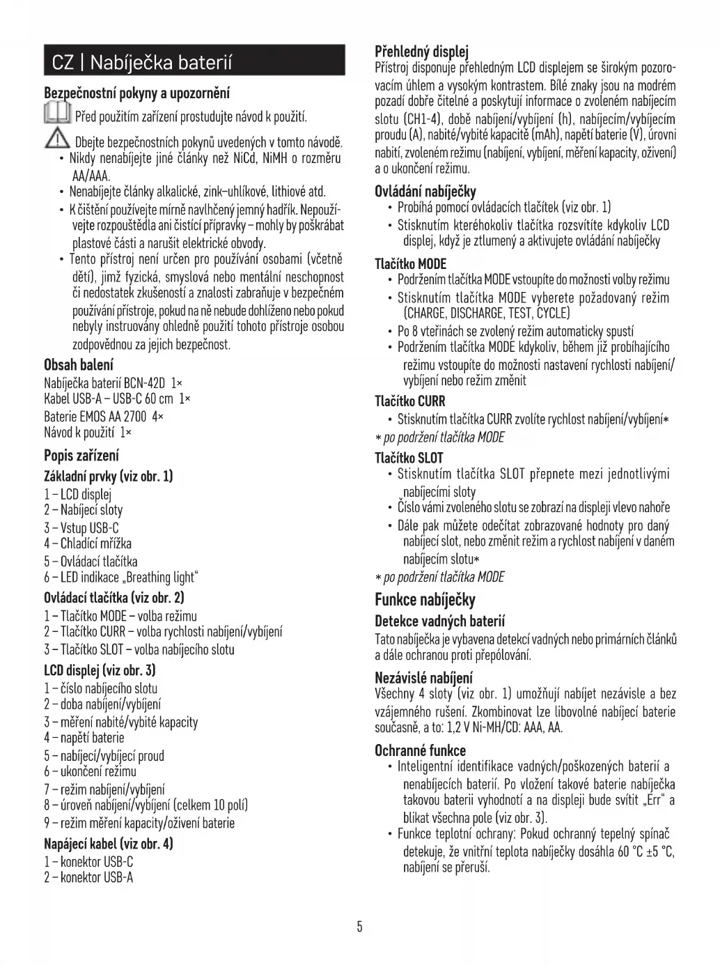 - Tento přístroj není určen pro používání osobami (včetně dětí), jimž fyzická, smyslová nebo mentální neschopnost či nedostatek zkušeností a znalosti zabraňuje v bezpečném používání přístroje, pokud na ně nebude dohlíženo nebo pokud nebyly instruovány ohledně použití tohoto přístroje osobou zodpovědnou za jejich bezpečnost. Obsah balení Nabíječka baterií BCN-42D 1× Kabel USB-A – USB-C 60 cm 1× Baterie EMOS AA 2700 4× Návod k použití 1× Popis zařízení Základní prvky (viz obr. 1) 1 – LCD displej 2 – Nabíjecí sloty 3 – Vstup USB-C 4 – Chladící mřížka 5 – Ovládací tlačítka 6 – LED indikace „Breathing light“ Ovládací tlačítka (viz obr. 2) 1 – Tlačítko MODE – volba režimu 2 – Tlačítko CURR – volba rychlosti nabíjení/vybíjení 3 – Tlačítko SLOT – volba nabíjecího slotu LCD displej (viz obr. 3) 1 – číslo nabíjecího slotu 2 – doba nabíjení/vybíjení 3 – měření nabité/vybité kapacity 4 – napětí baterie 5 – nabíjecí/vybíjecí proud 6 – ukončení režimu 7 – režim nabíjení/vybíjení 8 – úroveň nabíjení/vybíjení (celkem 10 polí) 9 – režim měření kapacity/oživení baterie Napájecí kabel (viz obr. 4) 1 – konektor USB-C 2 – konektor USB-A Přehledný displej Přístroj disponuje přehledným LCD displejem se širokým pozoro- vacím úhlem a vysokým kontrastem. Bílé znaky jsou na modrém pozadí dobře čitelné a poskytují informace o zvoleném nabíjecím slotu (CH1-4), době nabíjení/vybíjení (h), nabíjecím/vybíjecím proudu (A), nabité/vybité kapacitě (mAh), napětí baterie (V), úrovni nabití, zvoleném režimu (nabíjení, vybíjení, měření kapacity, oživení) a o ukončení režimu. Ovládání nabíječky