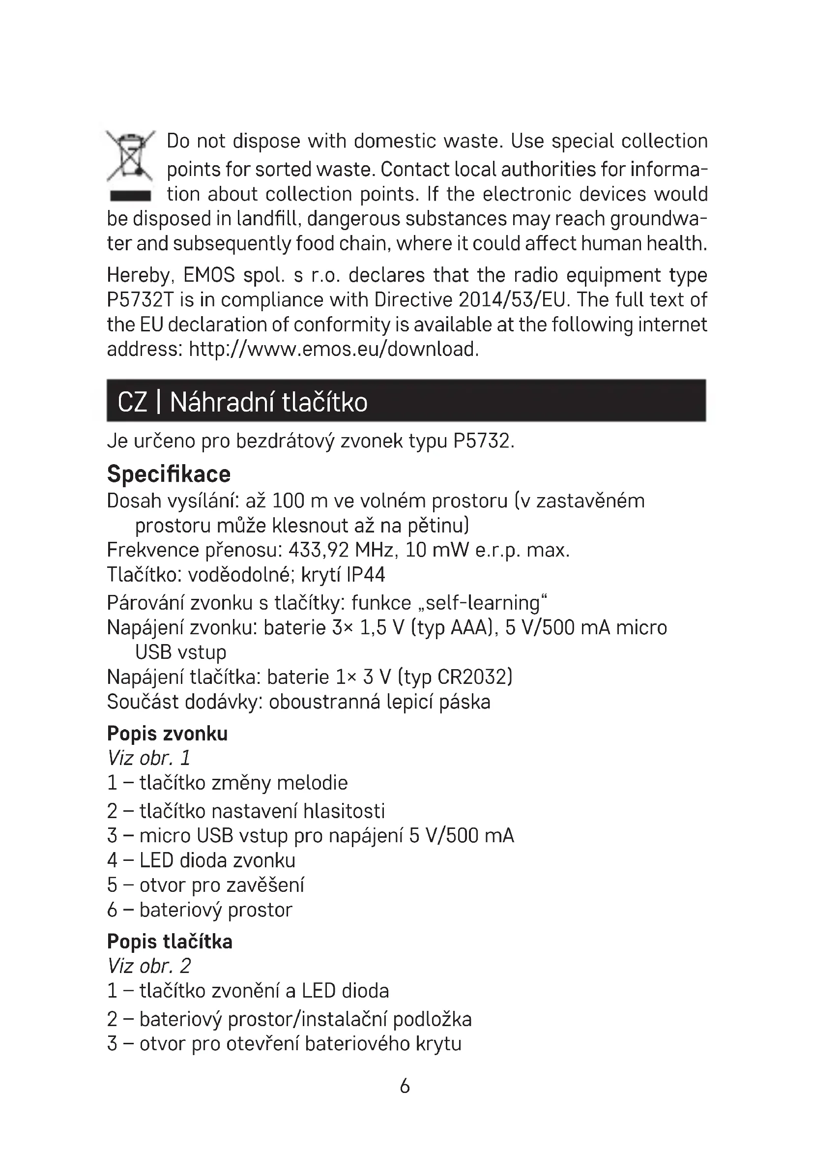 - This device is not intended for use by persons (including chil- dren) whose physical, sensory or mental disability or lack of experience and expertise prevents safe use, unless they are supervised or instructed in the use of the appliance by a person responsible for their safety. Children must always be supervised and must never play with the device.6 Do not dispose with domestic waste. Use special collection points for sorted waste. Contact local authorities for informa- tion about collection points. If the electronic devices would be disposed in landll, dangerous substances may reach groundwa- ter and subsequently food chain, where it could aect human health. Hereby, EMOS spol. s r.o. declares that the radio equipment type P5732T is in compliance with Directive 2014/53/EU. The full text of the EU declaration of conformity is available at the following internet address: http://www.emos.eu/download. CZ | Náhradní tlačítko Je určeno pro bezdrátový zvonek typu P5732. Specikace Dosah vysílání: až 100 m ve volném prostoru (v zastavěném prostoru může klesnout až na pětinu) Frekvence přenosu: 433,92 MHz, 10 mW e.r.p. max. Tlačítko: voděodolné; krytí IP44 Párování zvonku s tlačítky: funkce „self-learning“ Napájení zvonku: baterie 3× 1,5 V (typ AAA), 5 V/500 mA micro USB vstup Napájení tlačítka: baterie 1× 3 V (typ CR2032) Součást dodávky: oboustranná lepicí páska Popis zvonku Viz obr. 1 1 – tlačítko změny melodie 2 – tlačítko nastavení hlasitosti 3 – micro USB vstup pro napájení 5 V/500 mA 4 – LED dioda zvonku 5 – otvor pro zavěšení 6 – bateriový prostor Popis tlačítka Viz obr. 2 1 – tlačítko zvonění a LED dioda 2 – bateriový prostor/instalační podložka 3 – otvor pro otevření bateriového krytu7 4 – baterie Instalace tlačítka/sejmutí instalační podložky Viz obr. 3 1 – instalační podložka 2 – otvory na šroubek Párování tlačítka se zvonkem