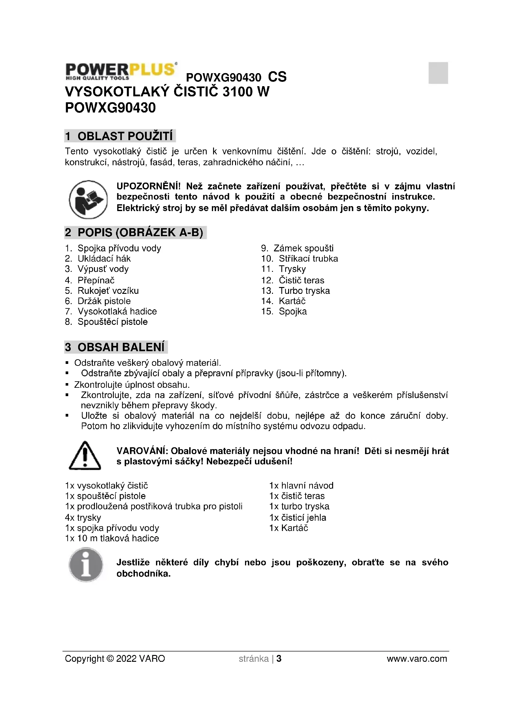 - Uložte si obalový materiál na co nejdelší dobu, nejlépe až do konce záruční doby. Potom ho zlikvidujte vyhozením do místního systému odvozu odpadu. VAROVÁNÍ: Obalové materiály nejsou vhodné na hraní! Děti si nesmějí hrát s plastovými sáčky! Nebezpečí udušení! 1x vysokotlaký čistič 1x spouštěcí pistole 1x prodloužená postřiková trubka pro pistoli 4x trysky 1x spojka přívodu vody 1x 10 m tlaková hadice 1x hlavní návod 1x čistič teras 1x turbo tryska 1x čisticí jehla 1x Kartáč Jestliže některé díly chybí nebo jsou poškozeny, obraťte se na svého obchodníka.POWXG90430 CS Copyright © 2022 VARO stránka | 4 www.varo.com 4 SYMBOLY V tomto návodu nebo na stroji se používají následující symboly: