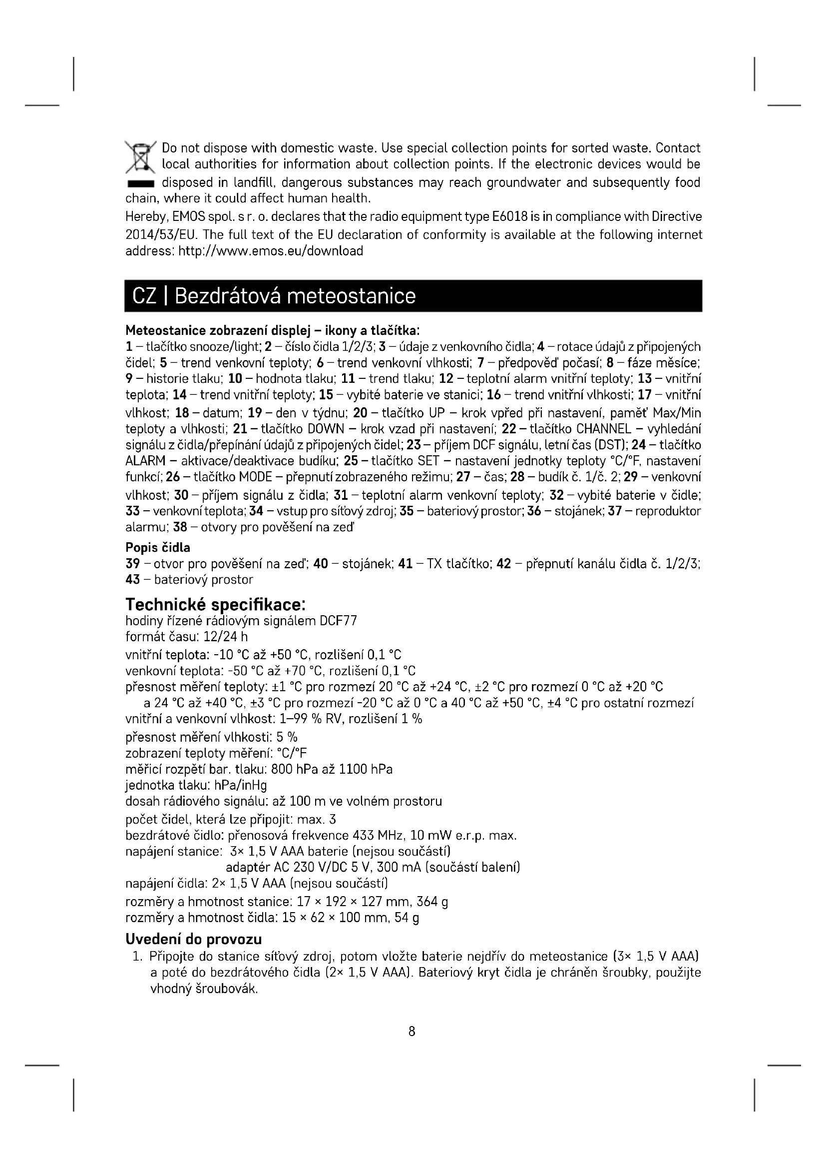 - This device is not intended for use by persons (including children) whose physical, sensory or mental disability or lack of experience and expertise prevents them from safely using the device, unless they are supervised or instructed in the use of the device by a person responsible for their safety. Children should be supervised to ensure they do not play with the device. After use, the device and batteries become hazardous waste – do not throw them into unsorted mu- nicipal waste, but return them to a collection point – e.g. the shop where you purchased the product.8 Do not dispose with domestic waste. Use special collection points for sorted waste. Contact local authorities for information about collection points. If the electronic devices would be disposed in landll, dangerous substances may reach groundwater and subsequently food chain, where it could aect human health. Hereby, EMOS spol. s r. o. declares that the radio equipment type E6018 is in compliance with Directive 2014/53/EU. The full text of the EU declaration of conformity is available at the following internet address: http://www.emos.eu/download CZ | Bezdrátová meteostanice Meteostanice zobrazení displej – ikony a tlačítka: 1 – tlačítko snooze/light; 2 – číslo čidla 1/2/3; 3 – údaje z venkovního čidla; 4 – rotace údajů z připojených čidel; 5 – trend venkovní teploty; 6 – trend venkovní vlhkosti; 7 – předpověď počasí; 8 – fáze měsíce; 9 – historie tlaku; 10 – hodnota tlaku; 11 – trend tlaku; 12 – teplotní alarm vnitřní teploty; 13 – vnitřní teplota; 14 – trend vnitřní teploty; 15 – vybité baterie ve stanici; 16 – trend vnitřní vlhkosti; 17 – vnitřní vlhkost; 18 – datum; 19 – den v týdnu; 20 – tlačítko UP – krok vpřed při nastavení, paměť Max/Min teploty a vlhkosti; 21 – tlačítko DOWN – krok vzad při nastavení; 22 – tlačítko CHANNEL – vyhledání signálu z čidla/přepínání údajů z připojených čidel; 23 – příjem DCF signálu, letní čas (DST); 24 – tlačítko ALARM – aktivace/deaktivace budíku; 25 – tlačítko SET – nastavení jednotky teploty °C/°F, nastavení funkcí; 26 – tlačítko MODE – přepnutí zobrazeného režimu; 27 – čas; 28 – budík č. 1/č. 2; 29 – venkovní vlhkost; 30 – příjem signálu z čidla; 31 – teplotní alarm venkovní teploty; 32 – vybité baterie v čidle; 33 – venkovní teplota; 34 – vstup pro síťový zdroj; 35 – bateriový prostor; 36 – stojánek; 37 – reproduktor alarmu; 38 – otvory pro pověšení na zeď Popis čidla 39 – otvor pro pověšení na zeď; 40 – stojánek; 41 – TX tlačítko; 42 – přepnutí kanálu čidla č. 1/2/3; 43 – bateriový prostor Technické specikace: hodiny řízené rádiovým signálem DCF77 formát času: 12/24 h vnitřní teplota: -10°C až +50°C, rozlišení 0,1°C venkovní teplota: -50°C až +70°C, rozlišení 0,1°C přesnost měření teploty: ±1°C pro rozmezí 20°C až +24°C, ±2°C pro rozmezí 0°C až +20°C a24°C až +40°C, ±3°C pro rozmezí -20°C až 0°C a 40°C až +50°C, ±4°C pro ostatní rozmezí vnitřní a venkovní vlhkost: 1–99 % RV, rozlišení 1 % přesnost měření vlhkosti: 5 % zobrazení teploty měření: °C/°F měřicí rozpětí bar. tlaku: 800 hPa až 1100 hPa jednotka tlaku: hPa/inHg dosah rádiového signálu: až 100 m ve volném prostoru počet čidel, která lze připojit: max. 3 bezdrátové čidlo: přenosová frekvence 433 MHz, 10 mW e.r.p. max. napájení stanice: 3× 1,5 V AAA baterie (nejsou součástí) adaptér AC 230 V/DC 5 V, 300 mA (součástí balení) napájení čidla: 2× 1,5 V AAA (nejsou součástí) rozměry a hmotnost stanice: 17 × 192 × 127 mm, 364 g rozměry a hmotnost čidla: 15 × 62 × 100 mm, 54 g Uvedení do provozu