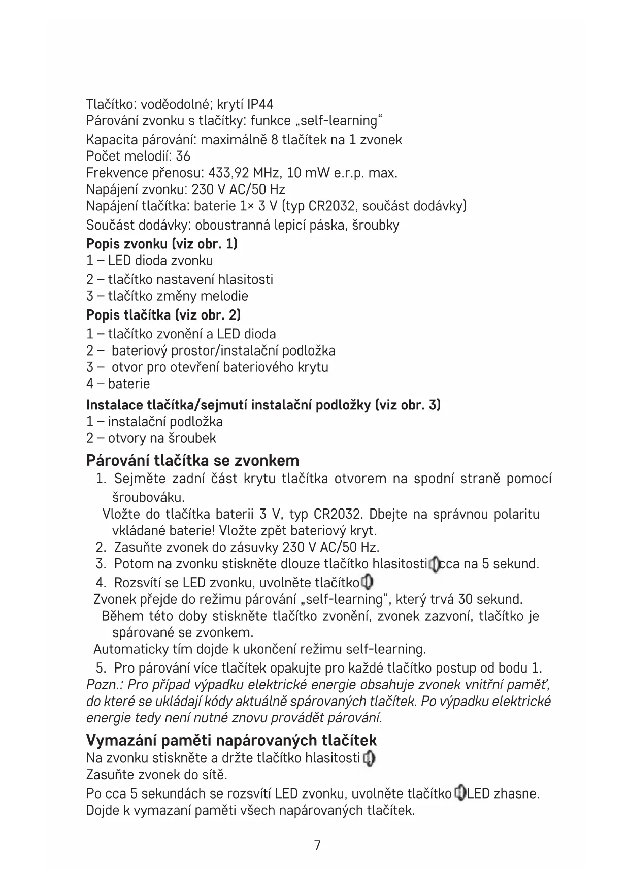 Zvonek přejde do režimu párování „self-learning“, který trvá 30 sekund. Během této doby stiskněte tlačítko zvonění, zvonek zazvoní, tlačítko je spárované se zvonkem. Automaticky tím dojde k ukončení režimu self-learning.