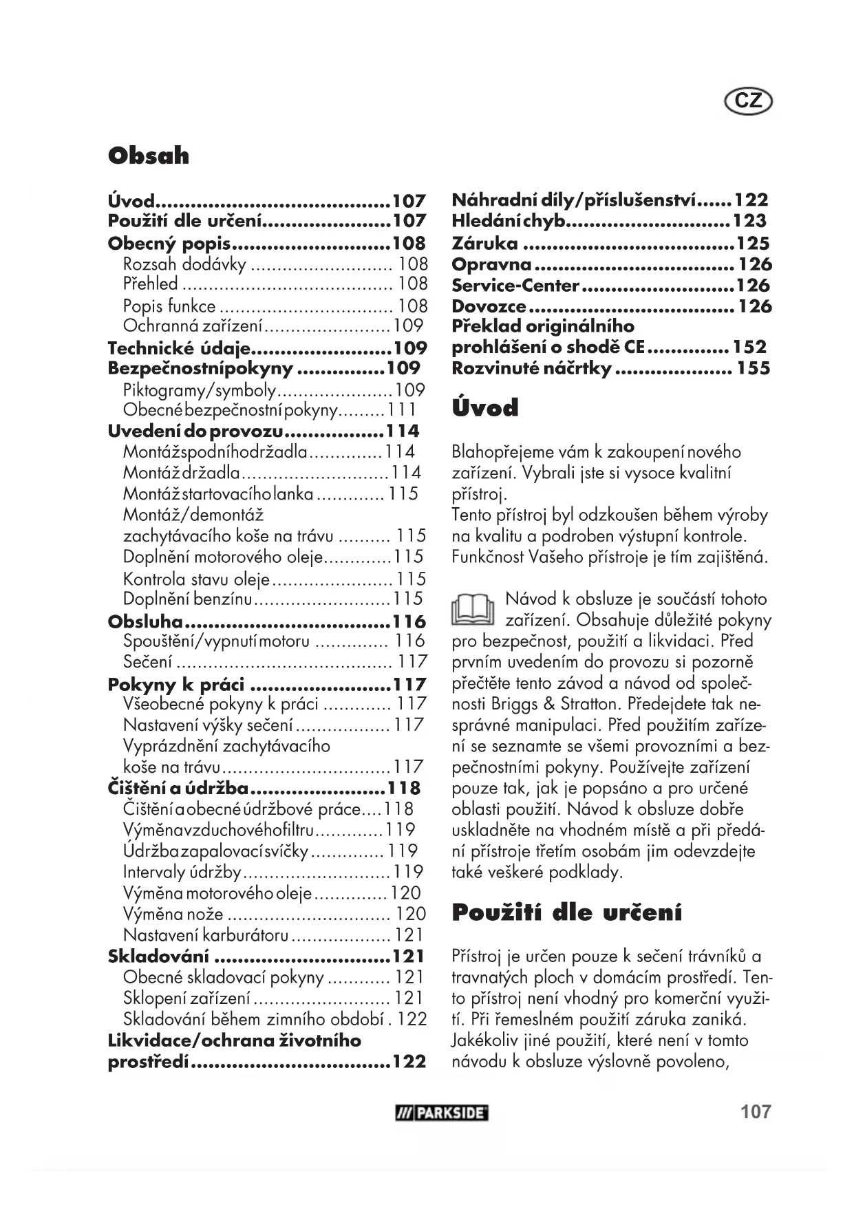 - Rozvinuté náčrtky Úvod Blahopřejeme vám k zakoupení nového zařízení. Vybrali jste si vysoce kvalitní přístroj. Tento přístroj byl odzkoušen během výroby na kvalitu a podroben výstupní kontrole. Funkčnost Vašeho přístroje je tím zajištěná. Návod k obsluze je součástí tohoto zařízení. Obsahuje důležité pokyny pro bezpečnost, použití a likvidaci. Před prvním uvedením do provozu si pozorně přečtěte tento závod a návod od společ- nosti Briggs & Stratton. Předejdete tak ne- správné manipulaci. Před použitím zaříze- ní se seznamte se všemi provozními a bez- pečnostními pokyny. Používejte zařízení pouze tak, jak je popsáno a pro určené oblasti použití. Návod k obsluze dobře uskladněte na vhodném místě a při předá- ní přístroje třetím osobám jim odevzdejte také veškeré podklady. Použitídleurčení Přístroj je určen pouze k sečení trávníků a travnatých ploch v domácím prostředí. Ten- to přístroj není vhodný pro komerční využi- tí. Při řemeslném použití záruka zaniká. Jakékoliv jiné použití, které není v tomto návodu k obsluze výslovně povoleno,108 p. 155