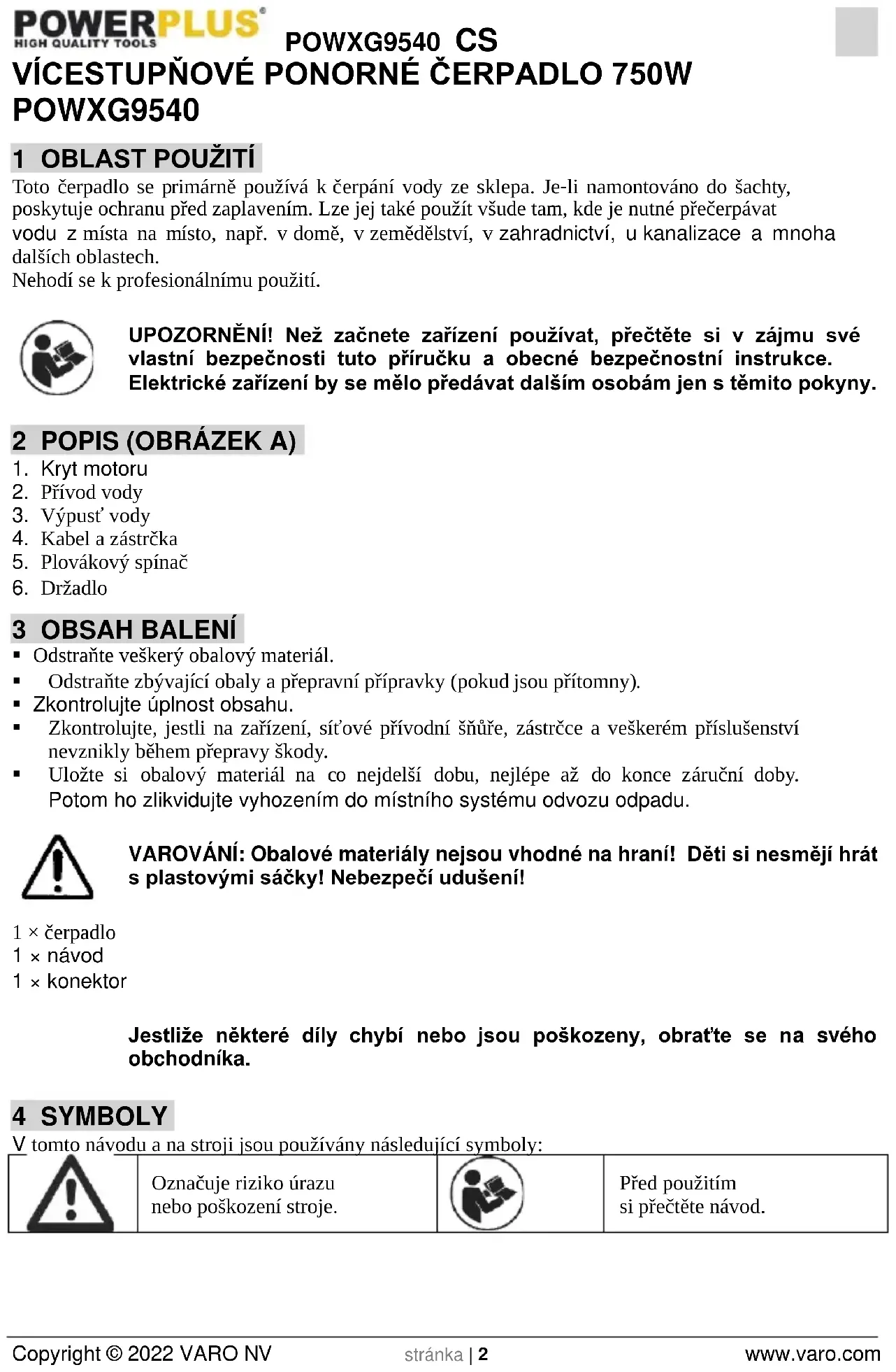 Před použitím si přečtěte návod.POWXG9540 CS Copyright © 2022 VARO NV stránka | 3 www.varo.com 5 OBECNÁ BEZPEČNOSTNÍ UPOZORNĚNÍ PRO ELEKTRICKÉ STROJE Přečtěte si všechna bezpečnostní upozornění a všechny pokyny. Nedodržení upozornění a pokynů může vést k úrazu elektrickým proudem, požáru nebo vážnému úrazu. Uschovejte si upozornění a pokyny, abyste do nich mohli později nahlédnout. Termín „elektrický stroj“ v upozorněních znamená elektrický stroj připojený (kabelem) k síti nebo elektrický stroj provozovaný (bez kabelu) na akumulátor. 6 PŘED SPUŠTĚNÍM VEZMĚTE V ÚVAHU NÁSLEDUJÍCÍ SKUTEČNOSTI!