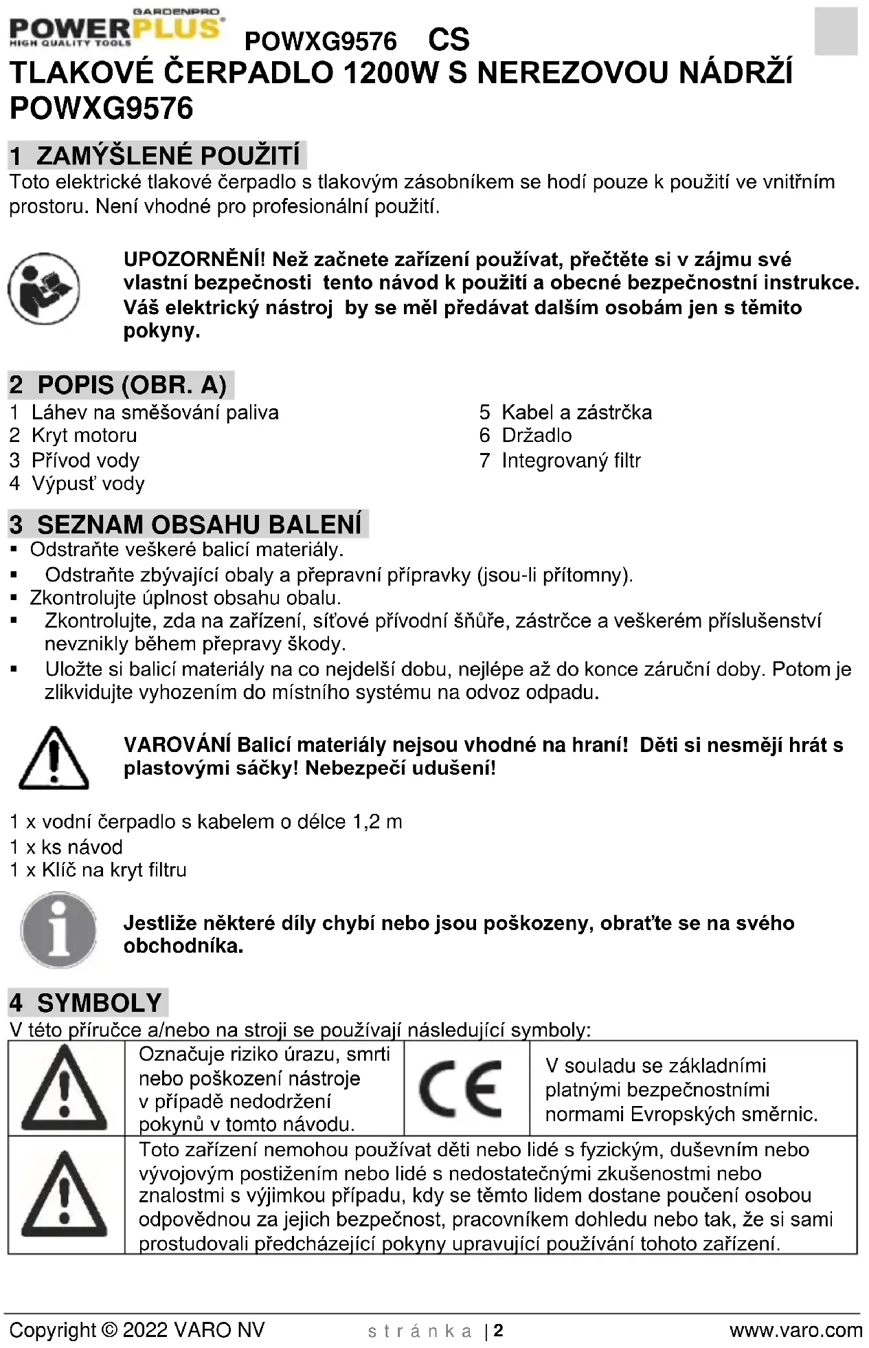 - Před údržbou čerpadlo vždy odpojte od sítě.POWXG9576 CS Copyright © 2022 VARO NV s t r á n k a | 5 www.varo.com