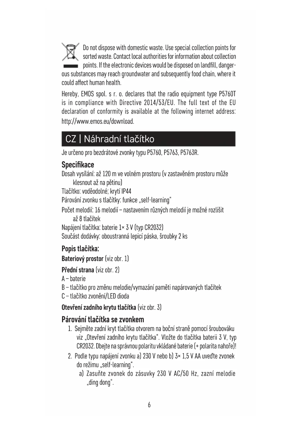 - This device is not intended for use by persons (including children) whose physical, sensory or mental disability or lack of experience and expertise prevents safe use, unless they are supervised or instructed in the use of the appliance by a person responsible for their safety. Children must always be supervised and must never play with the device.6 Do not dispose with domestic waste. Use special collection points for sorted waste. Contact local authorities for information about collection points. If the electronic devices would be disposed on landll, danger- ous substances may reach groundwater and subsequently food chain, where it could aect human health. Hereby, EMOS spol. s r. o. declares that the radio equipment type P5760T is in compliance with Directive 2014/53/EU. The full text of the EU declaration of conformity is available at the following internet address: http://www.emos.eu/download. CZ | Náhradní tlačítko Je určeno pro bezdrátové zvonky typu P5760, P5763, P5763R. Specikace Dosah vysílání: až 120 m ve volném prostoru (v zastavěném prostoru může klesnout až na pětinu) Tlačítko: voděodolné; krytí IP44 Párování zvonku s tlačítky: funkce „self-learning“ Počet melodií: 16 melodií – nastavením různých melodií je možné rozlišit až 8 tlačítek Napájení tlačítka: baterie 1× 3 V (typ CR2032) Součást dodávky: oboustranná lepicí páska, šroubky 2 ks Popis tlačítka: Bateriový prostor (viz obr. 1) Přední strana (viz obr. 2) A – baterie B – tlačítko pro změnu melodie/vymazání paměti napárovaných tlačítek C – tlačítko zvonění/LED dioda Otevření zadního krytu tlačítka (viz obr. 3) Párování tlačítka se zvonkem