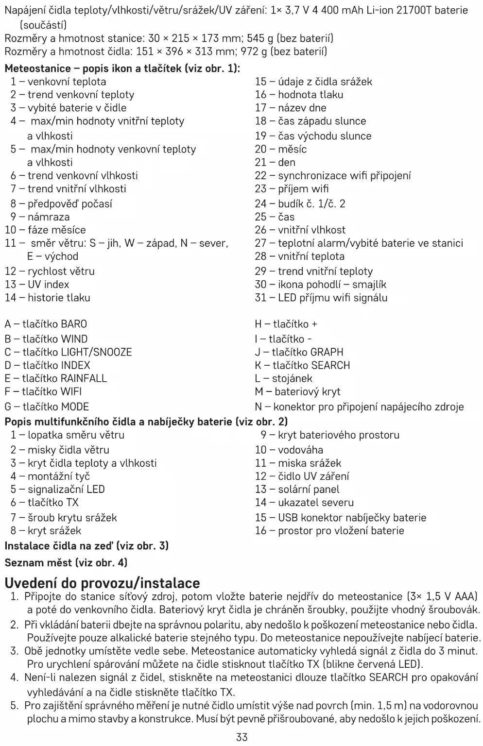 - Tento přístroj není určen pro používání osobami (včetně dětí), jimž fyzická, smyslová nebo mentální neschopnost či nedostatek zkušeností a znalostí zabraňuje v bezpečném používaní přístroje, pokud na ně nebude dohlíženo nebo pokud nebyly instruovány ohledně použití tohoto přístroje osobou zodpovědnou za jejich bezpečnost. Je nutný dohled nad dětmi, aby se zajistilo, že si nebudou s přístrojem hrát. Nevyhazujte elektrické spotřebiče jako netříděný komunální odpad, použijte sběrná místa tří- děného odpadu. Pro aktuální informace o sběrných místech kontaktujte místní úřady. Pokud jsou elektrické spotřebiče uložené na skládkách odpadků, nebezpečné látky mohou prosakovat do podzemní vody a dostat se do potravního řetězce a poškozovat vaše zdraví. Tímto EMOS spol. s r. o. prohlašuje, že typ rádiového zařízení E5059 je v souladu se směrnicí 2014/53/EU. Úplné znění EU prohlášení o shodě je k dispozici na těchto internetových stránkách http://www.emos.eu/download. Výrobek lze provozovat na základě všeobecného oprávnění č. VO-R/10/07.2021-8 v platném znění.40 SK | Bezdrôtová meteostanica Technické špecikácie: hodiny ovládané signálom wi Formát času: 12/24 h Vnútorná teplota: -10 °C – +50 °C, rozlíšenie 0,1 °C Vonkajšia teplota: -40 °C – +70 °C, rozlíšenie 0,1 °C Presnosť merania teploty: ±1 °C Vnútorná a vonkajšia vlhkosť: 1 % – 99 % RV, rozlíšenie 1 % Presnosť merania vlhkosti: 3 % pre rozsah 30 % až 80 %, inak 5 % Zobrazenie teploty merania: °C/°F Merané rozpätie bar. tlaku: 850 hPa až 1 050 hPa Jednotka tlaku: hPa/inHg/mmHg Merané rozpätie snímača vetra: 0–215 km/h Jednotka vetra: km/mph Merané rozpätie snímača zrážok: 0–999,9 mm Jednotka zrážok: mm/inch Dosah rádiového signálu: až 50 m vo voľnom priestore Prepojenie jednotiek: pomocou rádiového signálu 868 MHz, 25 mW e.r.p. max. Prepojenie hlavnej jednotky s wi sieťou: 2,4 GHz, 25 mW e.i.r.p. max. Napájnie stanice: 3× 1,5 V AAA batérie (nie sú súčasťou) Adaptér AC 230 V/DC 5 V, 1,2 A (súčasť balenia) Snímač teploty/vlhkosti/vetra/zrážok /UV žiarenia: 1× 3,7 V 4 400 mAh Li-ion 21700 T batéria (súčasťou) Rozmery a hmotnosť stanice: 30 × 215 × 173 mm; 545 g (bez baterií) Rozmery a hmotnosť snímača: 151 × 396 × 313 mm; 972 g (bez baterií) Meteostanica – popis ikon a tlačidiel (viď obr. 1): 1 – vonkajšia teplota 2 – trend vonkajšej teploty 3 – vybité batérie v snímači 4 – max/min hodnoty vnútornej teploty a vlhkosti 5 – max/min vonkajšia teplota a vlhkosť 6 – trend vonkajšej vlhkosti 7 – trend vnútornej vlhkosti 8 – predpoveď počasia 9 – námraza 10 – fáza Mesiaca 11 – smer vetra: S – juh, W – západ, N – sever, E – východ 12 – rýchlosť vetra 13 – UV index 14 – história tlaku 15 – údaje snímača zrážok 12 – rýchlosť vetra 13 – UV index 14 – história tlaku 15 – údaje snímača zrážok 16 – hodnota tlaku 17 – názov dňa 18 – čas západu slnka 19 – čas východu slnka 20 – mesiac 21 – deň 22 – synchronizácia wi pripojenia 23 – príjem wi 24 – budík č. 1/č. 2 25 – čas 26 – vnútorná vlhkosť 27 – teplotný alarm/ vybité batérie v stanici 28 – vnútorná teplota 29 – trend vnútornej teploty 30 – ikona pohodlia – smajlík 31 – LED príjmu wi signálu A – tlačidlo BARO B – tlačidlo WIND C – tlačidlo LIGHT/SNOOZE D – tlačidlo INDEX E – tlačidlo RAINFALL F – tlačidlo WIFI G – tlačidlo MODE H – tlačidlo +41 I – tlačidlo - J – tlačidlo GRAPH K – tlačidlo SEARCH L – stojan M – batériový kryt N – konektor pre pripojenie napájacieho zdroja Popis multifunkčného snímača a nabíjačky batérie (viď obr. 2) 1 – lopatka smeru vetra 2 – misky snímača vetra 3 – kryt snímača teploty a vlhkosti 4 – montážna tyč 5 – signalizačná LED 6 – tlačidlo TX 7 – skrutka krytu zrážok 8 – kryt zrážok 9 – kryt batériového priestoru 10 – vodováha 11 – miska zrážok 12 – snímač UV žiarenia 13 – solárny panel 14 – ukazovateľ severu 15 – USB konektor nabíjačky batérie 16 – priestor pre vloženie batérie Inštalácia snímača na stenu (viď obr. 3) Zoznam miest (viď obr. 4) Inštalácia
