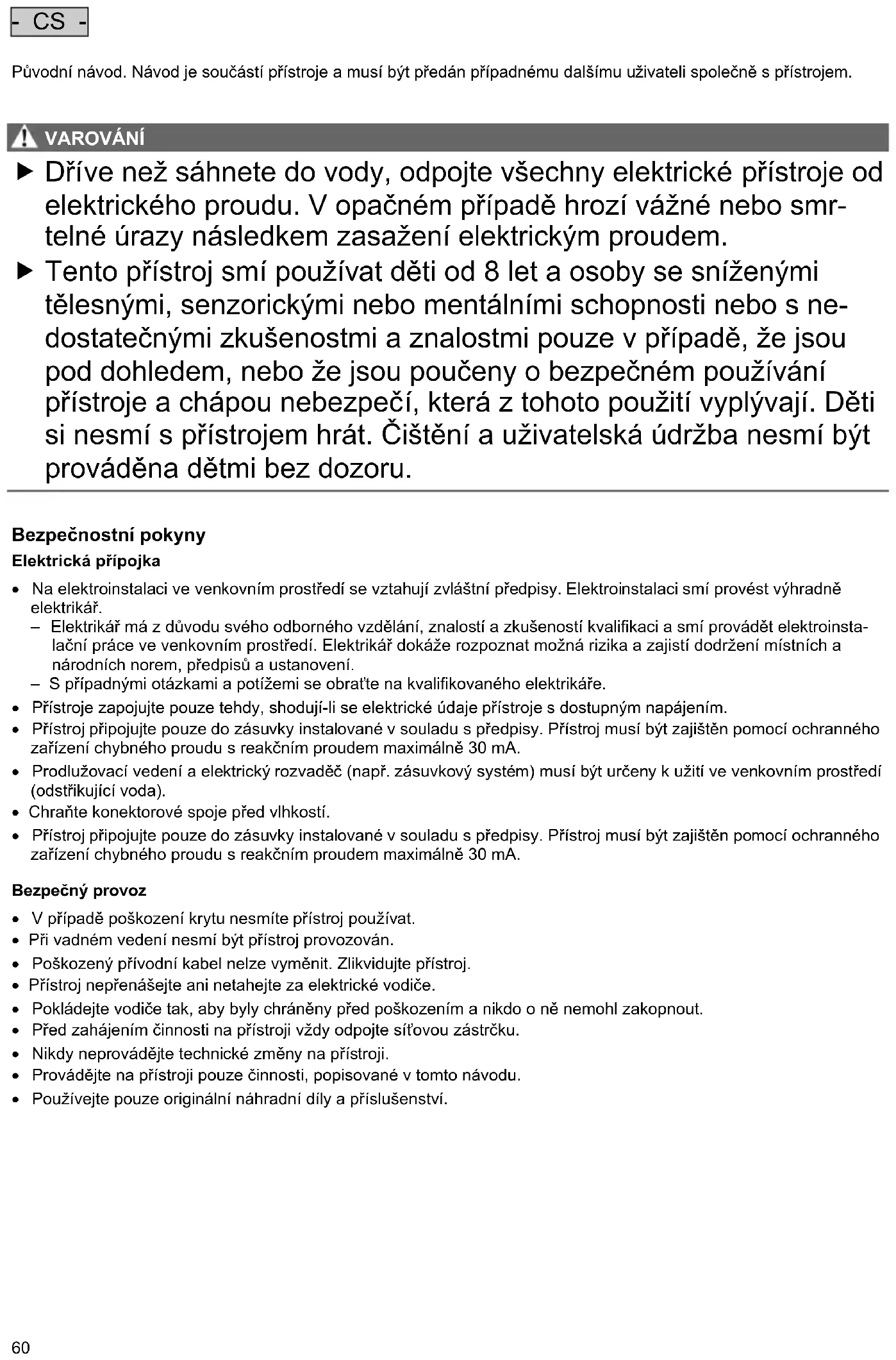 VAROVÁNÍ VAROVÁNÍ Dříve než sáhnete do vody, odpojte všechny elektrické přístroje od elektrického proudu. V opačném případě hrozí vážné nebo smr- telné úrazy následkem zasažení elektrickým proudem. Tento přístroj smí používat děti od 8 let a osoby se sníženými tělesnými, senzorickými nebo mentálními schopnosti nebo s ne- dostatečnými zkušenostmi a znalostmi pouze v případě, že jsou pod dohledem, nebo že jsou poučeny o bezpečném používání přístroje a chápou nebezpečí, která z tohoto použití vyplývají. Děti si nesmí s přístrojem hrát. Čištění a uživatelská údržba nesmí být prováděna dětmi bez dozoru.