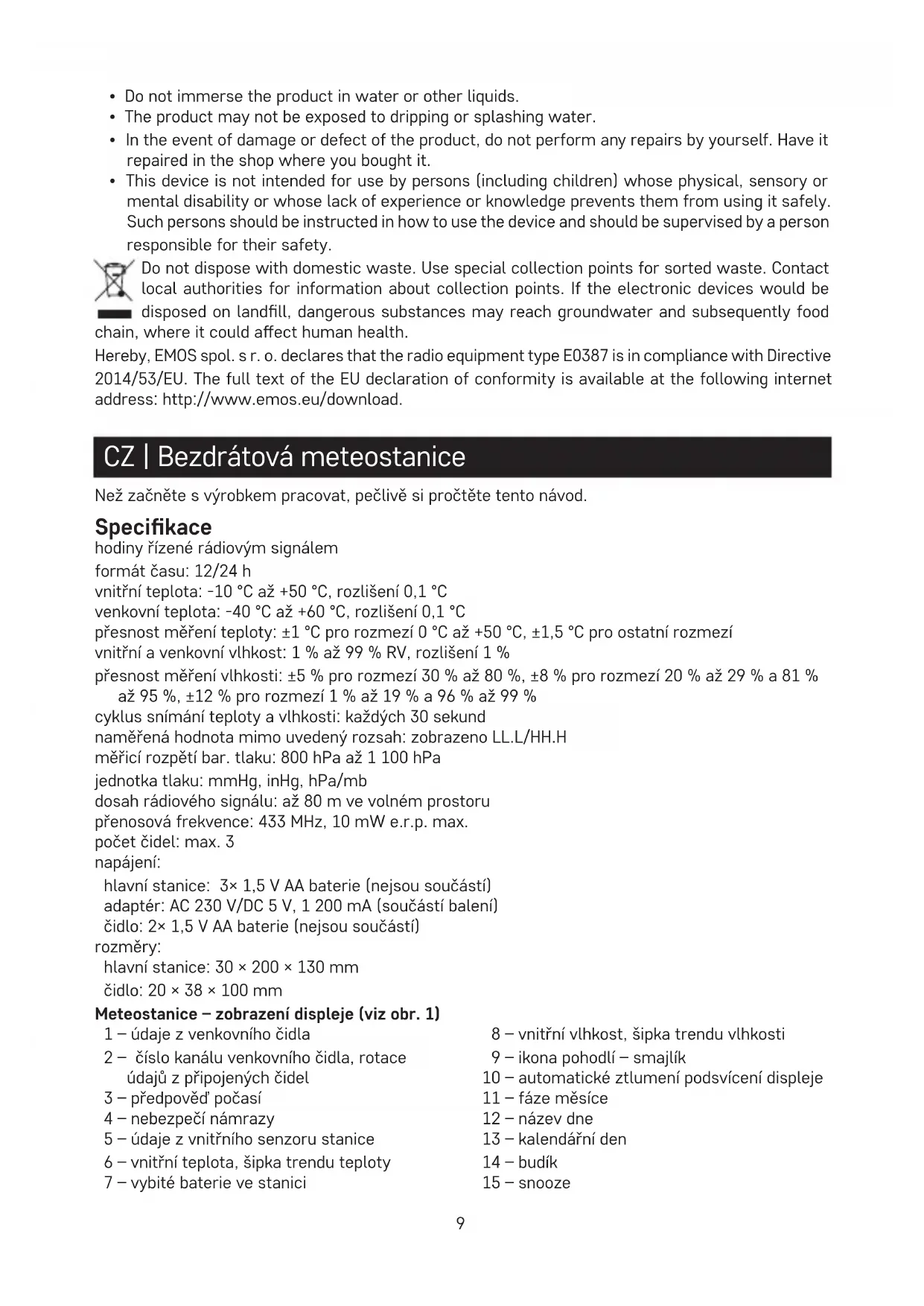 - Tento přístroj není určen pro používání osobami (včetně dětí), jimž fyzická, smyslová nebo mentální neschopnost či nedostatek zkušeností a znalostí zabraňuje v bezpečném používání přístroje, pokud na ně nebude dohlíženo nebo pokud nebyly instruovány ohledně použití tohoto přístroje osobou zodpovědnou za jejich bezpečnost. Nevyhazujte elektrické spotřebiče jako netříděný komunální odpad, použijte sběrná místa tří- děného odpadu. Pro aktuální informace o sběrných místech kontaktujte místní úřady. Pokud jsou elektrické spotřebiče uložené na skládkách odpadků, nebezpečné látky mohou prosakovat do podzemní vody a dostat se do potravního řetězce a poškozovat vaše zdraví. Tímto EMOS spol. s r. o. prohlašuje, že typ rádiového zařízení E0387 je v souladu se směrnicí 2014/53/EU. Úplné znění EU prohlášení o shodě je k dispozici na těchto internetových stránkách http://www.emos.eu/download. Výrobek lze provozovat na základě všeobecného oprávnění č. VO-R/10/07.2021-8 v platném znění. SK | Bezdrôtová meteostanica Skôr ako začnete s výrobkom pracovať, starostlivo si prečítajte tento návod. Špecikácia hodiny riadené rádiovým signálom formát času: 12/24 h vnútorná teplota: -10 °C až +50 °C, rozlíšenie 0,1 °C vonkajšia teplota: -40 °C až +60 °C, rozlíšenie 0,1 °C presnosť merania teploty: ±1 °C pre rozmedzie 0 °C až +50 °C, ±1,5 °C pre ostatné rozmedzie vnútorná a vonkajšia vlhkosť: 1 % až 99 % RV, rozlíšenie 1 % presnosť merania vlhkosti: ±5 % pre rozmedzie 30 % až 80 %, ±8 % pre rozmedzie 20 % až 29 % a 81 % až 95 %, ±12 % pre rozmedzie 1 % až 19 % a 96 % až 99 % cyklus snímania teploty a vlhkosti: každých 30 sekúnd nameraná hodnota mimo uvedený rozsah: zobrazené LL.L/HH.H meracie rozpätie bar. tlaku: 800 hPa až 1 100 hPa jednotka tlaku: mmHg, inHg, hPa/mb dosah rádiového signálu: až 80 m vo voľnom priestore prenosová frekvencia: 433 MHz, 10 mW e.r.p. max. počet čidiel: max. 3 napájanie: hlavná stanica: 3× 1,5 V AA batérie (nie sú súčasťou) adaptér: AC 230 V/DC 5 V, 1 200 mA (súčasťou balenia) čidlo: 2× 1,5 V AA batérie (nie sú súčasťou) rozmery: hlavná stanica: 30 × 200 × 130 mm čidlo: 20 × 38 × 100 mm Meteostanica – zobrazenie displeja (viď obr. 1) 1 – údaje z vonkajšieho čidla 2 – číslo kanála vonkajšieho čidla, rotácia údajov z pripojených čidiel 3 – predpoveď počasia 4 – nebezpečenstvo námrazy 5 – údaje z vnútorného senzora stanice15 6 – vnútorná teplota, šípka trendu teploty 7 – vybité batérie v stanici 8 – vnútorná vlhkosť, šípka trendu vlhkosti 9 – ikona pohodlia – smajlík 10 – automatické stlmenie podsvietenia displeja 11 – fáza mesiaca 12 – názov dňa 13 – kalendárny deň 14 – budík 15 – snooze 16 – kalendárny mesiac 17 – čas 18 – príjem DCF signálu 19 – hodnota tlaku 20 – vonkajšia vlhkosť, šípka trendu vlhkosti 21 – vybité batérie v čidle 22 – teplotný limit 23 – vonkajšia teplota Popis tlačidiel (viď obr. 2) 1 – SNOOZE/LIGHT 2 – konektor pre pripojenie napájacieho adaptéra 3 – nastavenie budíka 4 – ALERT 5 – MEM 6 – 7 – 8 – SET 9 – otvor pre zavesenie na stenu 10 – batériový priestor 11 – stojanček Popis čidla (viz obr. 3) 1 – LED dióda 2 – otvor na zavesenie na stenu 3 – prepínač voľby kanálov (CH 1, 2, 3) 4 – batériový kryt Uvedenie do prevádzky