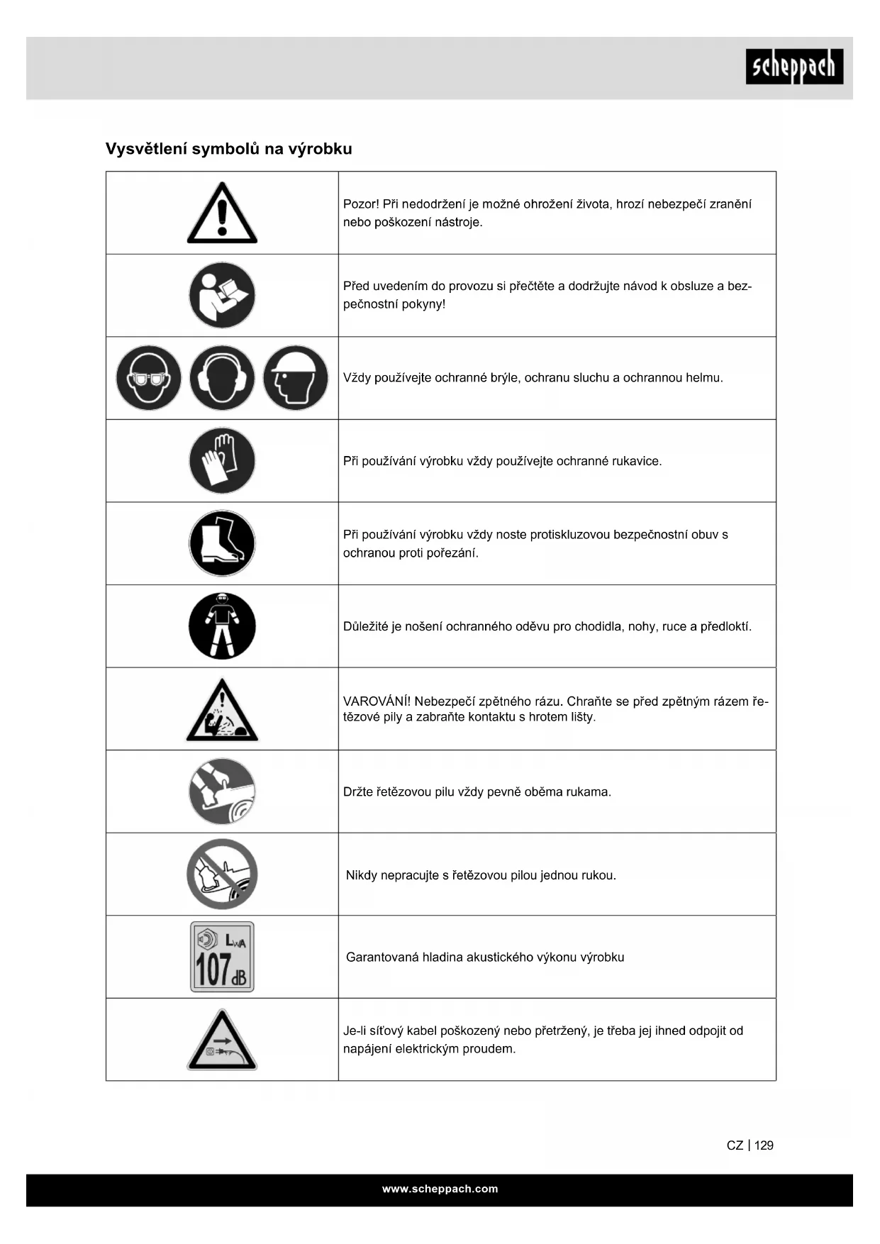 Vysvětlení symbolů na výrobku Pozor! Při nedodržení je možné ohrožení života, hrozí nebezpečí zranění nebo poškození nástroje. Před uvedením do provozu si přečtěte a dodržujte návod k obsluze a bez- pečnostní pokyny! Vždy používejte ochranné brýle, ochranu sluchu a ochrannou helmu. Při používání výrobku vždy používejte ochranné rukavice. Při používání výrobku vždy noste protiskluzovou bezpečnostní obuv s ochranou proti pořezání. Důležité je nošení ochranného oděvu pro chodidla, nohy, ruce a předloktí. VAROVÁNÍ! Nebezpečí zpětného rázu. Chraňte se před zpětným rázem ře- tězové pily a zabraňte kontaktu s hrotem lišty. Držte řetězovou pilu vždy pevně oběma rukama. Nikdy nepracujte s řetězovou pilou jednou rukou. Garantovaná hladina akustického výkonu výrobku Je-li síťový kabel poškozený nebo přetržený, je třeba jej ihned odpojit od napájení elektrickým proudem.www.scheppach.com