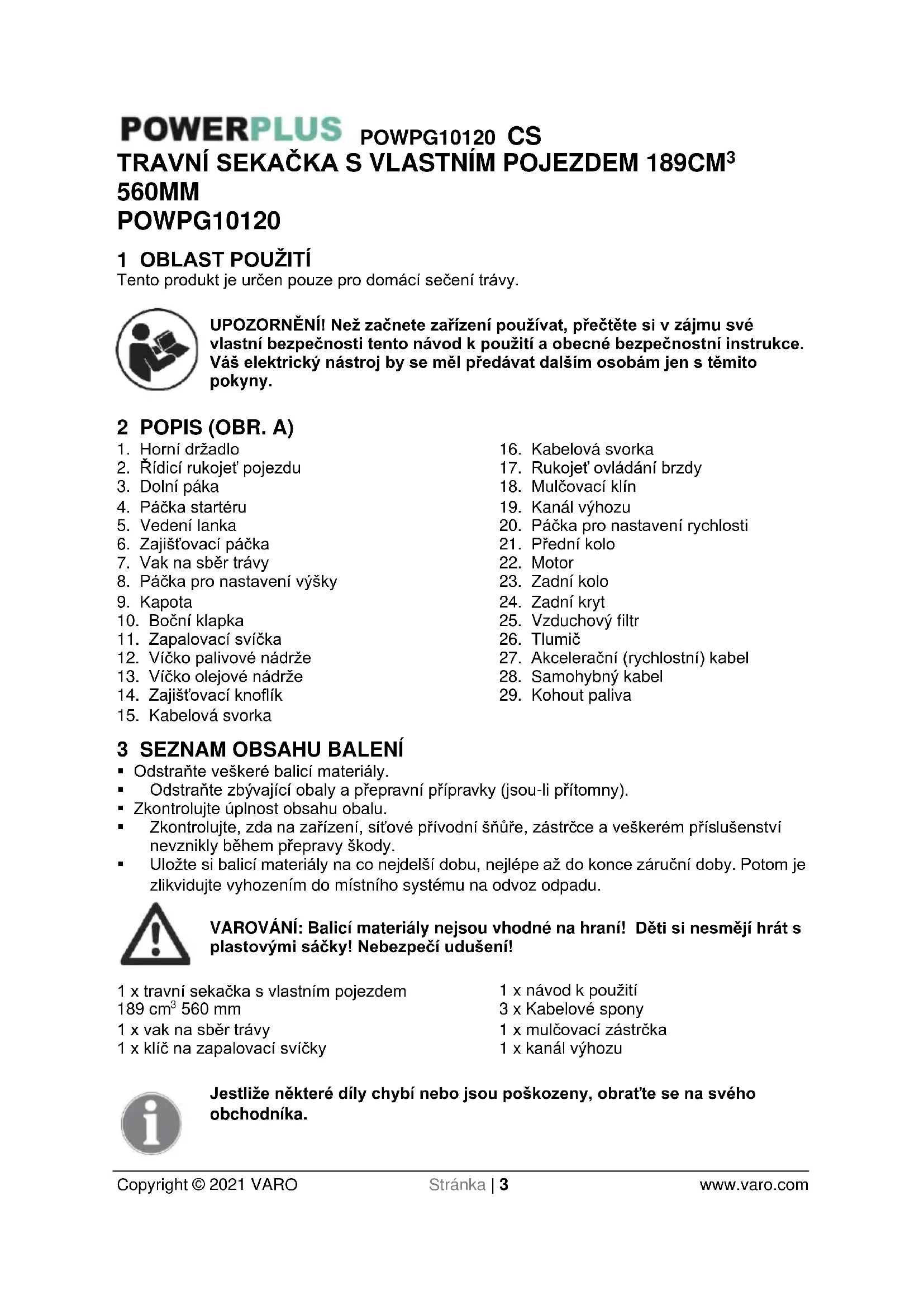 - Používejte pouze doporučené nože a náhradní díly od výrobce. Použití neoriginálních dílů může poškodit stroj a zranit obsluhu. Udržujte travní sekačku v dobrém stavu.POWPG10120 CS Copyright © 2021 VARO Stránka | 7 www.varo.com