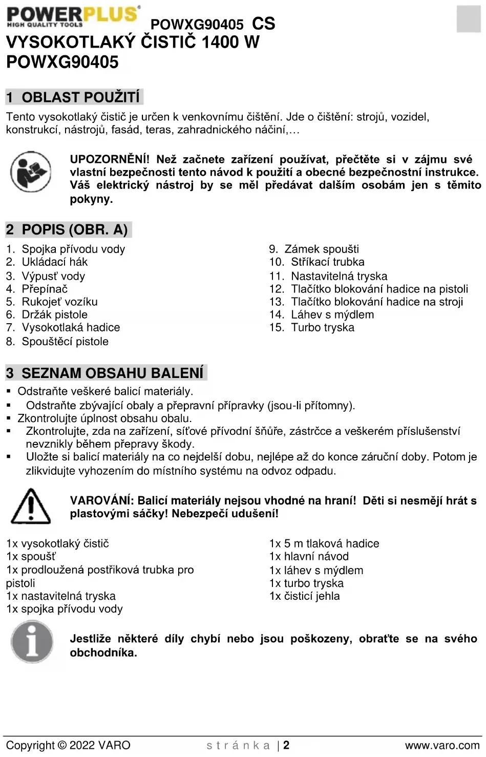 - Uložte si balicí materiály na co nejdelší dobu, nejlépe až do konce záruční doby. Potom je zlikvidujte vyhozením do místního systému na odvoz odpadu. VAROVÁNÍ: Balicí materiály nejsou vhodné na hraní! Děti si nesmějí hrát s plastovými sáčky! Nebezpečí udušení! 1x vysokotlaký čistič 1x spoušť 1x prodloužená postřiková trubka pro pistoli 1x nastavitelná tryska 1x spojka přívodu vody 1x 5 m tlaková hadice 1x hlavní návod 1x láhev s mýdlem 1x turbo tryska 1x čisticí jehla Jestliže některé díly chybí nebo jsou poškozeny, obraťte se na svého obchodníka.POWXG90405 CS Copyright © 2022 VARO s t r á n k a | 3 www.varo.com 4 DOPLŇKOVÉ BEZPEČNOSTNÍ PŘEDPISY PRO VYSOKOTLAKÉ ČISTIČE