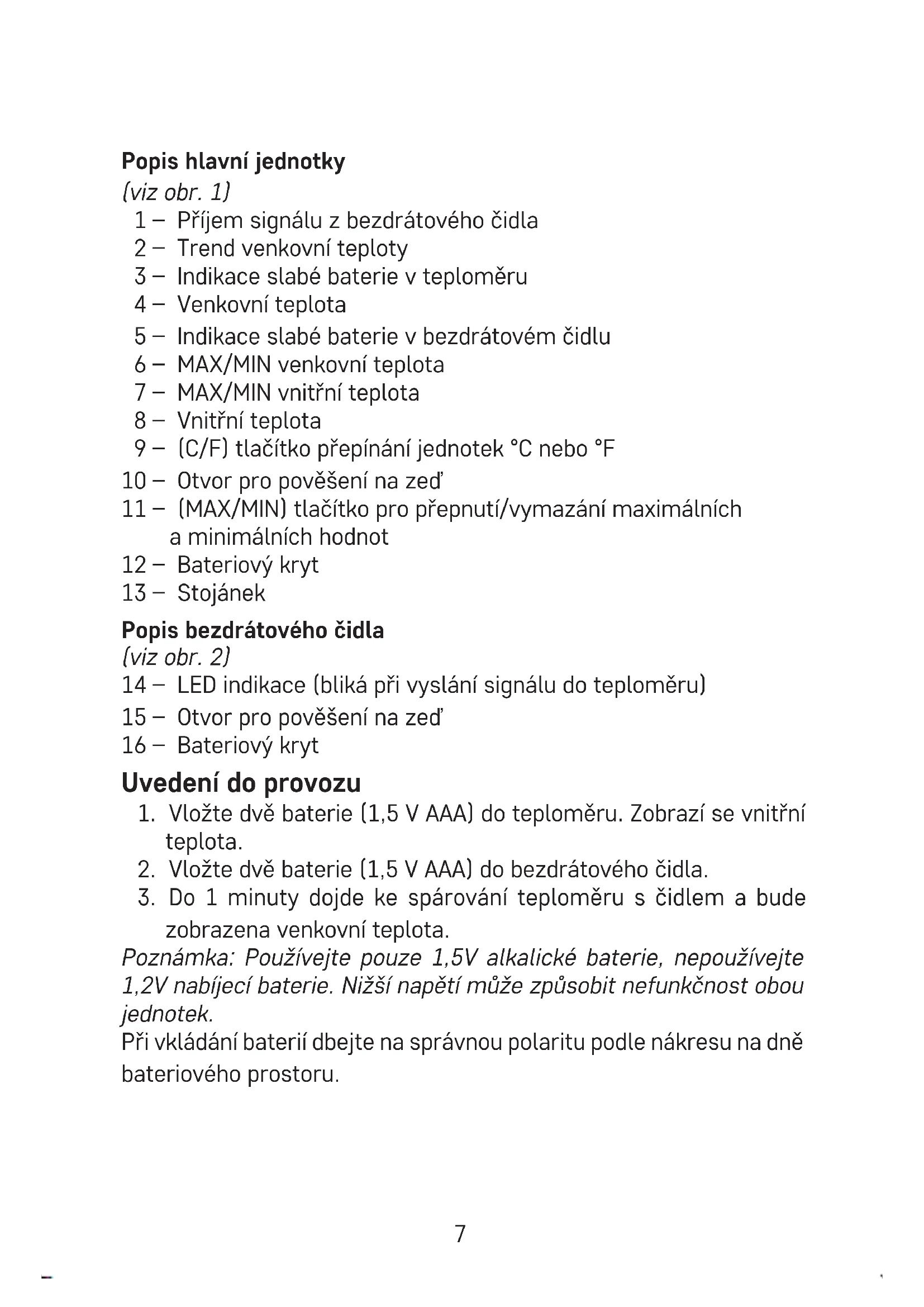 zobrazena venkovní teplota. Poznámka: Používejte pouze 1,5V alkalické baterie, nepoužívejte 1,2V nabíjecí baterie. Nižší napětí může způsobit nefunkčnost obou jednotek. Při vkládání baterií dbejte na správnou polaritu podle nákresu na dně bateriového prostoru.8 V případě, že teploměr nezobrazuje údaje z venkovního čidla, zkontrolujte:
