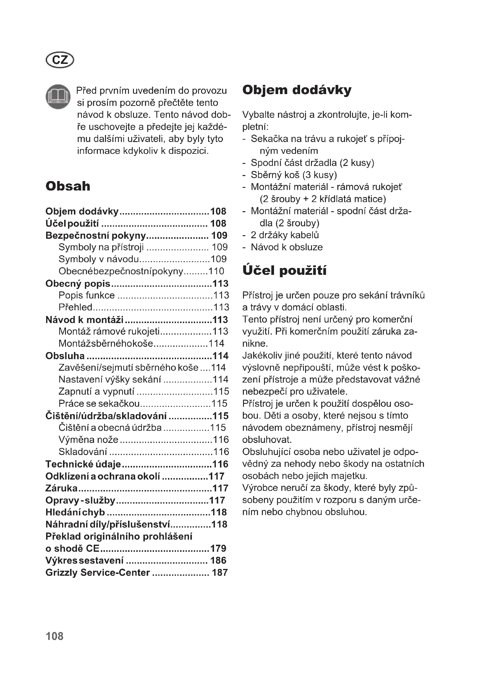 - Objem dodávky Vybalte nástroj a zkontrolujte, je-li kom- pletní: - Sekačka na trávu a rukojeť s přípoj- ným vedením - Spodní část držadla (2 kusy) - Sběrný koš (3 kusy) - Montážní materiál - rámová rukojeť (2 šrouby + 2 křídlatá matice) - Montážní materiál - spodní část drža- dla (2 šrouby) - 2 držáky kabelů - Návod k obsluze Účel použití Přístroj je určen pouze pro sekání trávníků a trávy v domácí oblasti. Tento přístroj není určený pro komerční využití. Při komerčním použití záruka za- nikne. Jakékoliv jiné použití, které tento návod výslovně nepřipouští, může vést k poško- zení přístroje a může představovat vážné nebezpečí pro uživatele. Přístroj je určen k použití dospělou oso- bou. Děti a osoby, které nejsou s tímto návodem obeznámeny, přístroj nesmějí obsluhovat. Obsluhující osoba nebo uživatel je odpo- vědný za nehody nebo škody na ostatních osobách nebo jejich majetku. Výrobce neručí za škody, které byly způ- sobeny použitím v rozporu s daným urče- ním nebo chybnou obsluhou. Před prvním uvedením do provozu si prosím pozorně přečtěte tento návod k obsluze. Tento návod dob- ře uschovejte a předejte jej každé- mu dalšími uživateli, aby byly tyto informace kdykoliv k dispozici. Překlad originálního prohlášení o shodě CE p. 179
