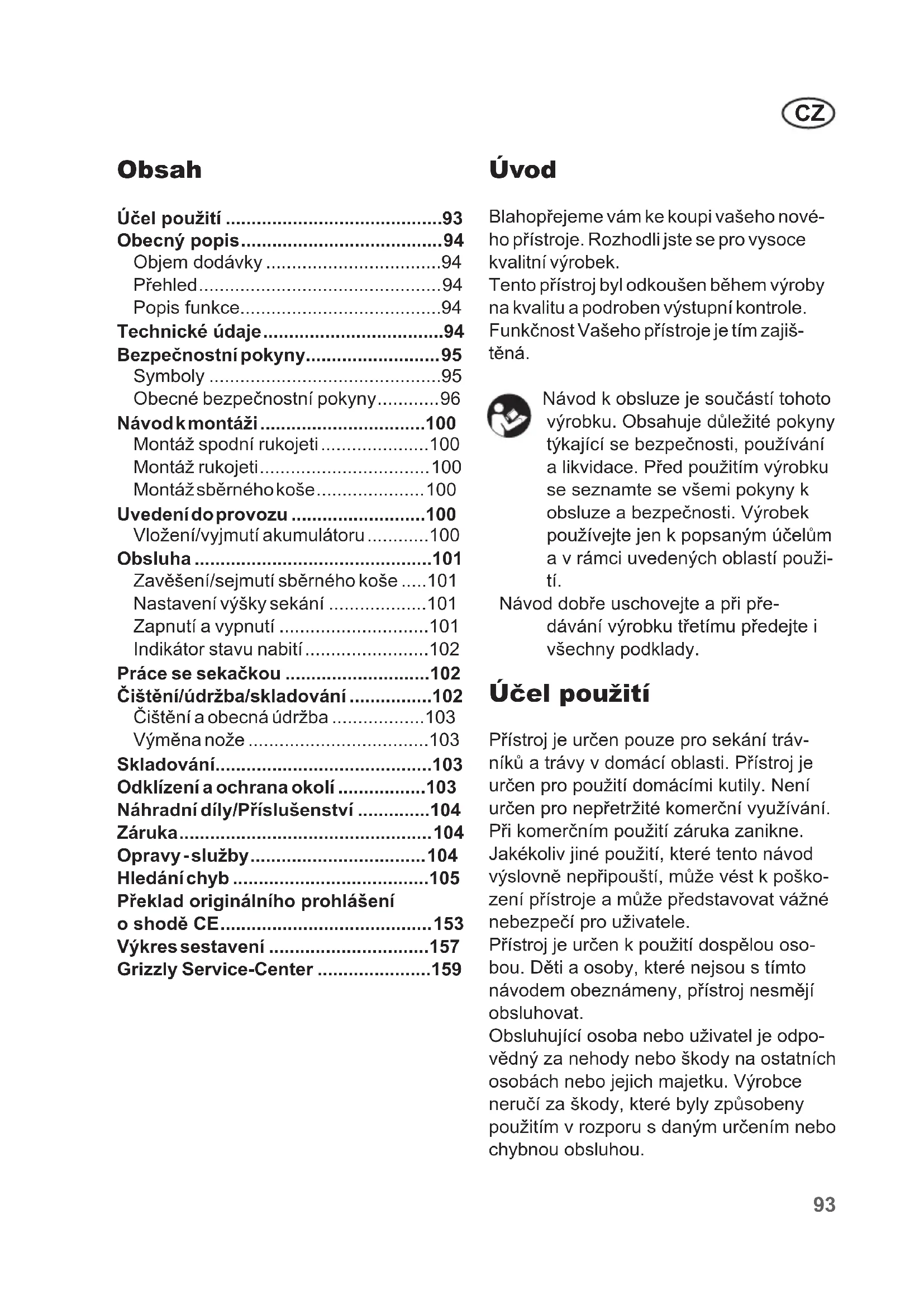 - Úvod Blahopřejeme vám ke koupi vašeho nové- ho přístroje. Rozhodli jste se pro vysoce kvalitní výrobek. Tento přístroj byl odkoušen během výroby na kvalitu a podroben výstupní kontrole. Funkčnost Vašeho přístroje je tím zajiš- těná. Návod k obsluze je součástí tohoto výrobku. Obsahuje důležité pokyny týkající se bezpečnosti, používání a likvidace. Před použitím výrobku se seznamte se všemi pokyny k obsluze a bezpečnosti. Výrobek používejte jen k popsaným účelům a v rámci uvedených oblastí použi- tí. Návod dobře uschovejte a při pře- dávání výrobku třetímu předejte i všechny podklady. Účel použití Přístroj je určen pouze pro sekání tráv- níků a trávy v domácí oblasti. Přístroj je určen pro použití domácími kutily. Není určen pro nepřetržité komerční využívání. Při komerčním použití záruka zanikne. Jakékoliv jiné použití, které tento návod výslovně nepřipouští, může vést k poško- zení přístroje a může představovat vážné nebezpečí pro uživatele. Přístroj je určen k použití dospělou oso- bou. Děti a osoby, které nejsou s tímto návodem obeznámeny, přístroj nesmějí obsluhovat. Obsluhující osoba nebo uživatel je odpo- vědný za nehody nebo škody na ostatních osobách nebo jejich majetku. Výrobce neručí za škody, které byly způsobeny použitím v rozporu s daným určením nebo chybnou obsluhou. Překlad originálního prohlášení o shodě CE p. 153
