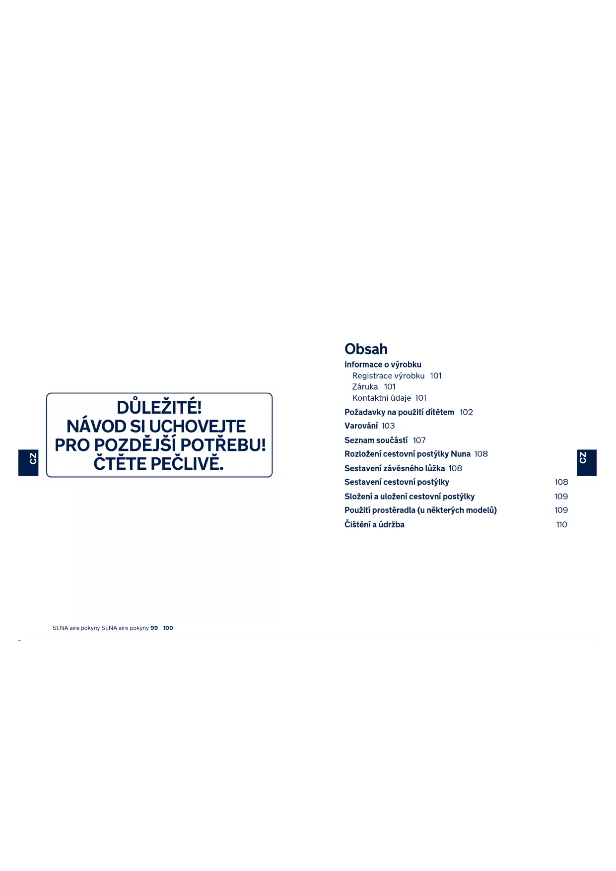 PRO POZDĚJŠÍ POTŘEBU! ČTĚTE PEČLIVĚ. Obsah Informace o výrobku Registrace výrobku 101 Záruka 101 Kontaktní údaje 101 Požadavky na použití dítětem 102 Varování 103 Seznam součástí 107 Rozložení cestovní postýlky Nuna 108 Sestavení závěsného lůžka 108 Sestavení cestovní postýlky 108 Složení a uložení cestovní postýlky 109 Použití prostěradla (u některých modelů) 109 Čištění a údržba 110SENA aire pokyny SENA aire pokyny 101 102