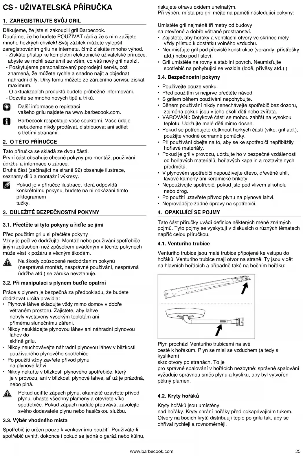 Tato část příručky uvádí denice některých méně známých pojmů. Tyto pojmy se vyskytují v diskusích o různých tématech napříč celou příručkou. 4.1. Venturiho trubice Venturiho trubice jsou malé trubice připojené ke vstupu do hořáků. Venturiho trubice mají otvor na straně. Ty jsou vidět na hlavních hořácích a případně také na bočním hořáku: Plyn prochází Venturiho trubicemi na své cestě k hořákům. Plyn se mísí se vzduchem (a tedy s kyslíkem) skrz otvory po stranách. To je pro správné spalování v hořácích nezbytné: správné spalování vyžaduje správnou směs plynu a kyslíku, aby byl vytvořen pěkný plamen. 4.2. Kryty hořáků Kryty hořáků jsou umístěny nad hořáky. Kryty chrání hořáky před odkapávajícím tukem. Otvory na bocích krytů distribuují teplo po grilu tak, aby se ohříval rychleji a rovnoměrněji.www.barbecook.com