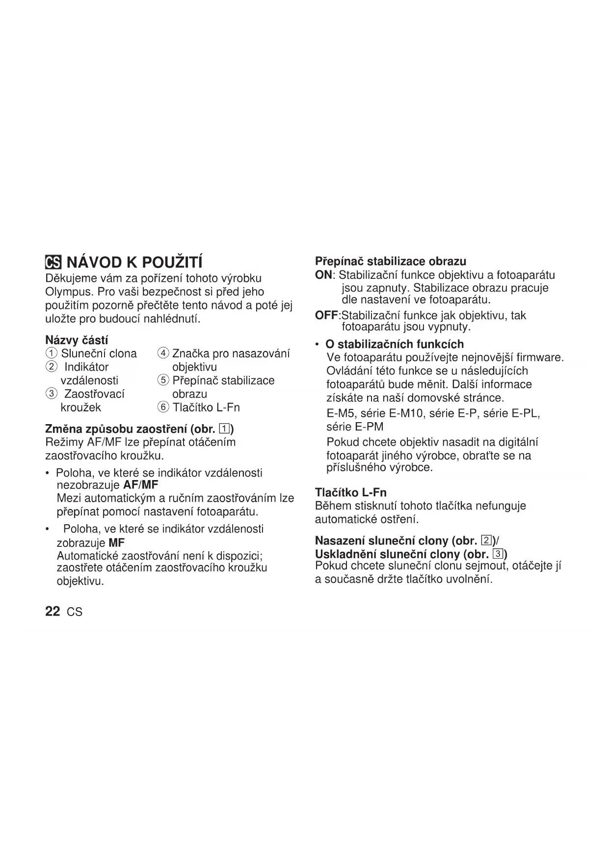 Děkujeme vám za pořízení tohoto výrobku Olympus. Pro vaši bezpečnost si před jeho použitím pozorně přečtěte tento návod a poté jej uložte pro budoucí nahlédnutí. Názvy částí 1 Sluneční clona 2 Indikátor vzdálenosti 3 Zaostřovací kroužek