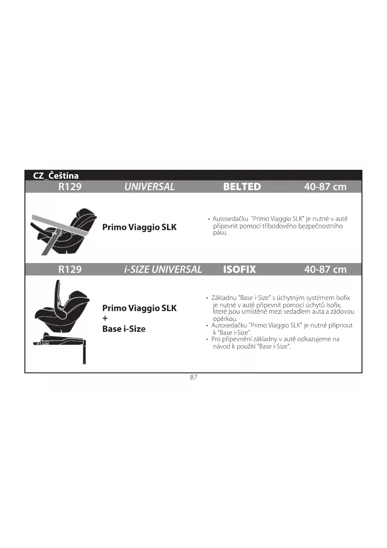 - Pro připevnění základny v autě odkazujeme na návod k použití "Base i-Size". R129 UNIVERSAL BELTED 40-87 cm R129 i-SIZE UNIVERSAL ISOFIX 40-87 cm Primo Viaggio SLK Primo Viaggio SLK