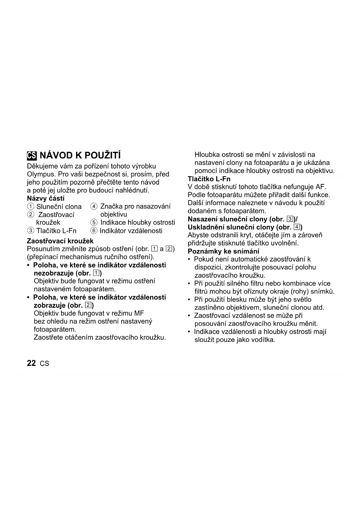 Děkujeme vám za pořízení tohoto výrobku Olympus. Pro vaši bezpečnost si, prosím, před jeho použitím pozorně přečtěte tento návod a poté jej uložte pro budoucí nahlédnutí. Názvy částí 1 Sluneční clona 2 Zaostřovací kroužek 3 Tlačítko L-Fn