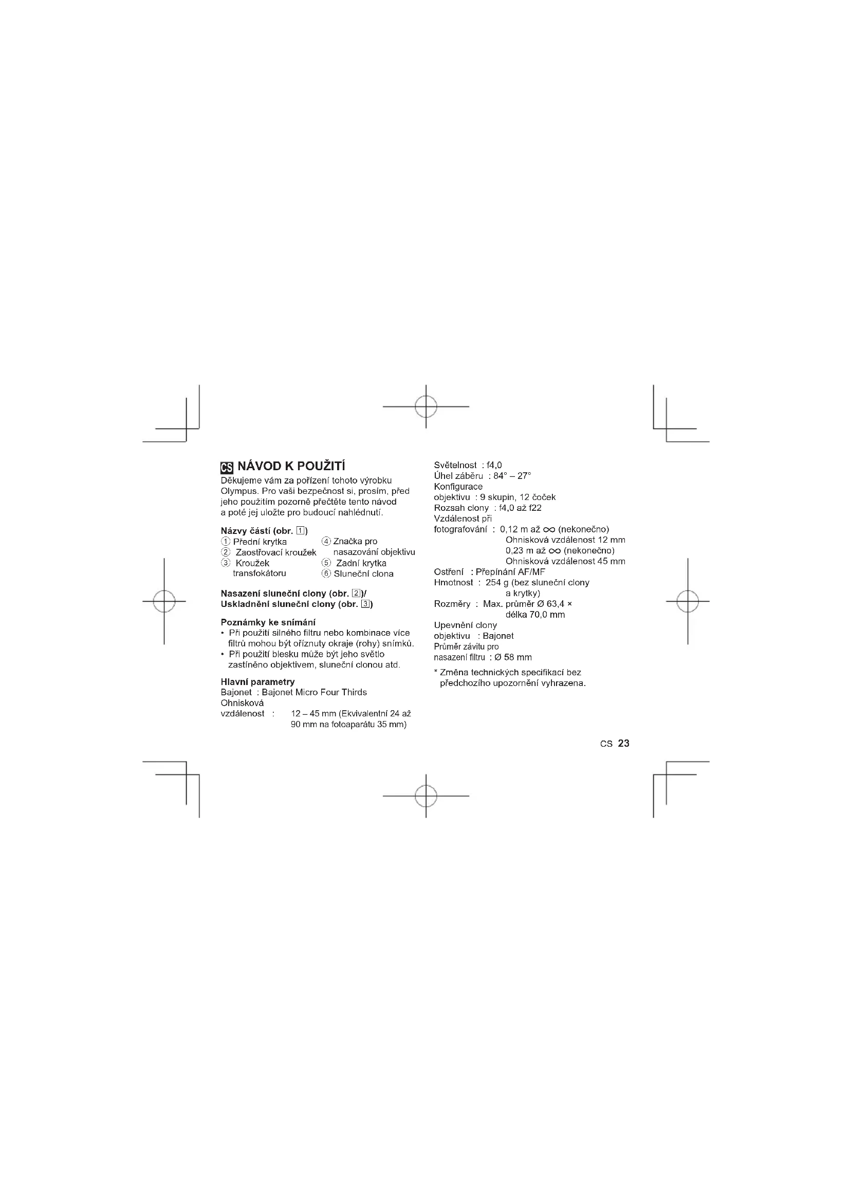 ED 1245mm F4.0 PRO - Objektiv OLYMPUS - Bezplatný návod k obsluze