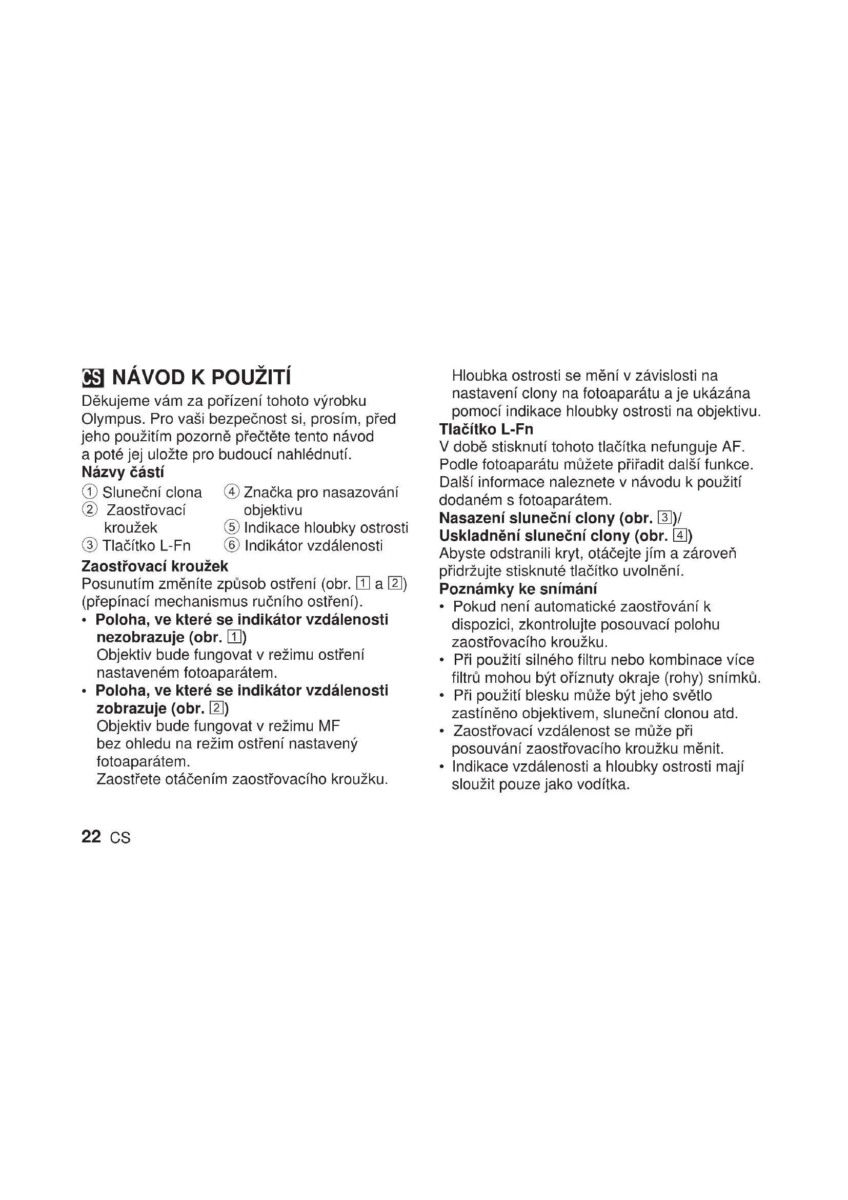 Děkujeme vám za pořízení tohoto výrobku Olympus. Pro vaši bezpečnost si, prosím, před jeho použitím pozorně přečtěte tento návod a poté jej uložte pro budoucí nahlédnutí. Názvy částí 1 Sluneční clona 2 Zaostřovací kroužek 3 Tlačítko L-Fn