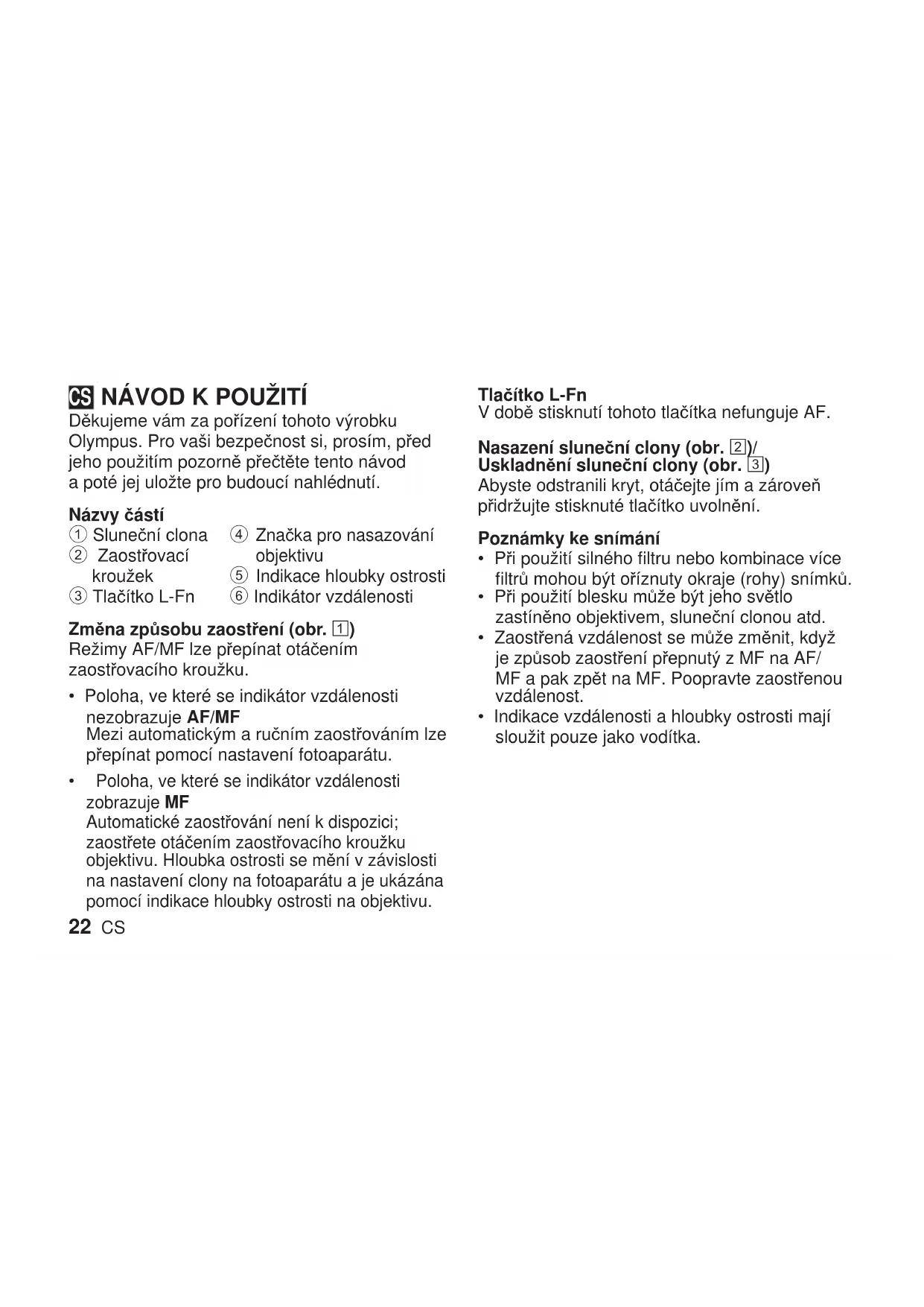 Děkujeme vám za pořízení tohoto výrobku Olympus. Pro vaši bezpečnost si, prosím, před jeho použitím pozorně přečtěte tento návod a poté jej uložte pro budoucí nahlédnutí. Názvy částí 1 Sluneční clona 2 Zaostřovací kroužek 3 Tlačítko L-Fn
