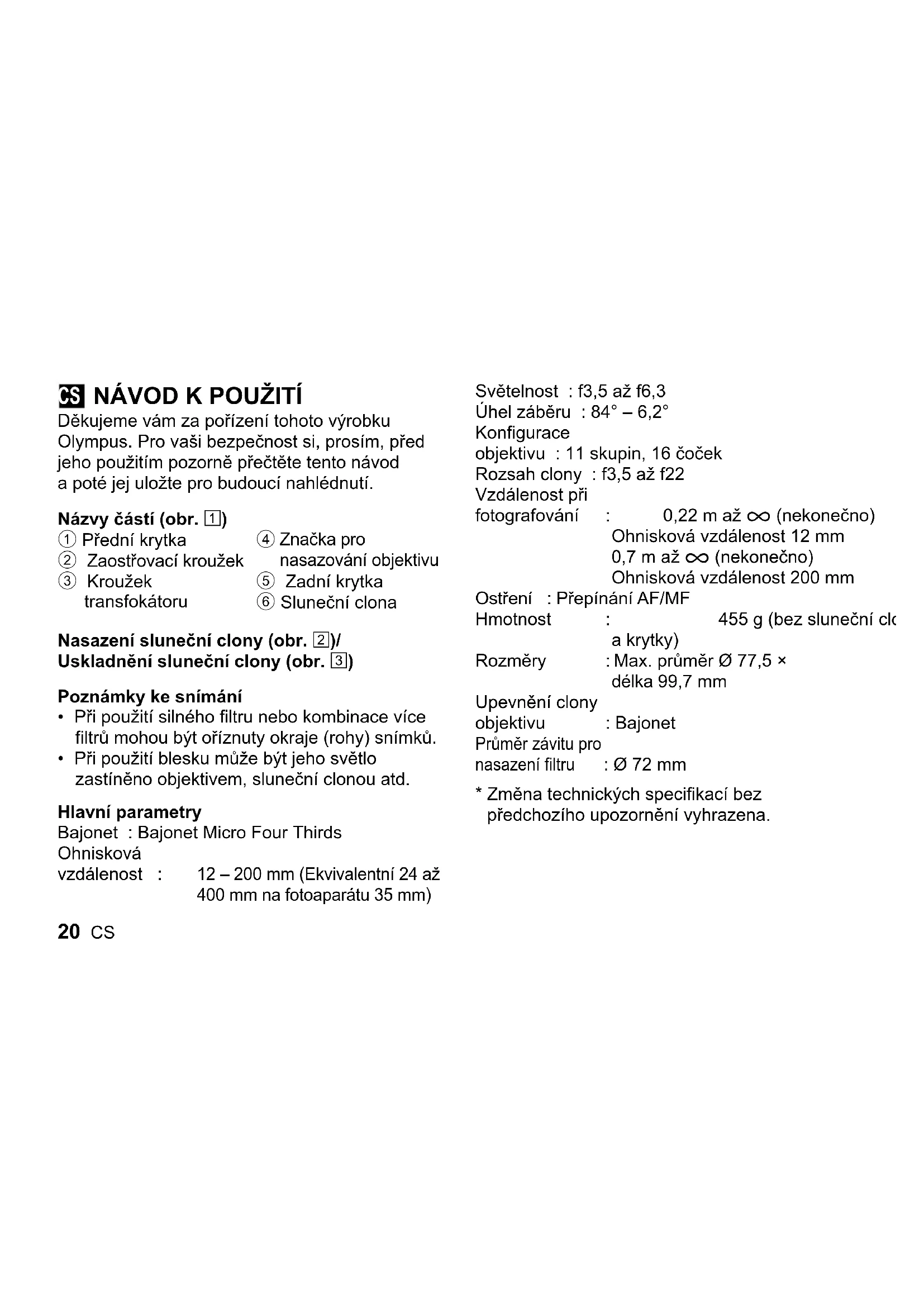 Děkujeme vám za pořízení tohoto výrobku Olympus. Pro vaši bezpečnost si, prosím, před jeho použitím pozorně přečtěte tento návod a poté jej uložte pro budoucí nahlédnutí. Názvy částí (obr. 1) 1 Přední krytka 2 Zaostřovací kroužek 3 Kroužek transfokátoru