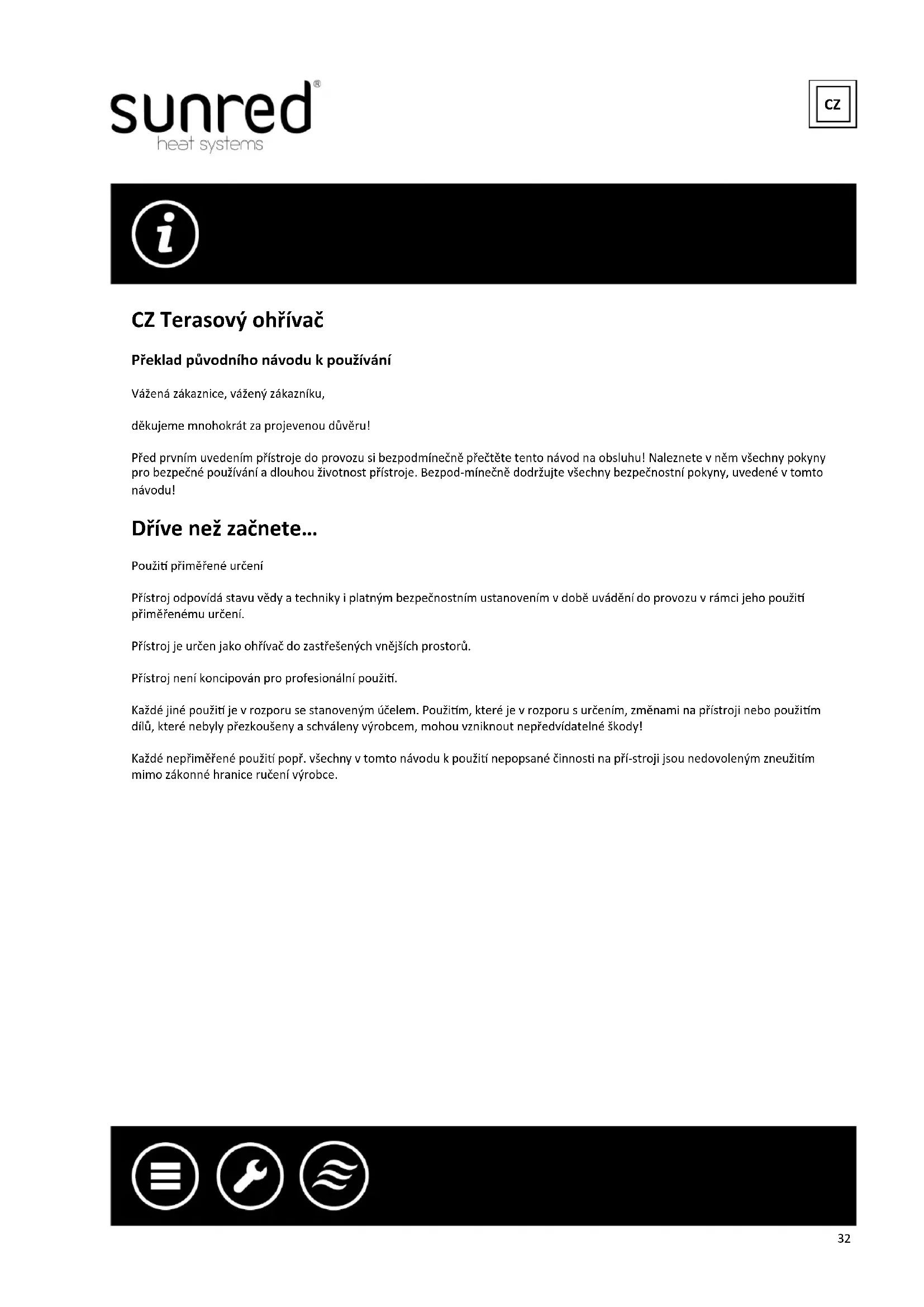 Descripción del defecto: Falta de una descripción detallada del producto puede dicultar el inicio del proceso de reparación y alargar el empo necesario para la reparación del aparato. Falta de una determinación detallada del defecto puede causar una dicultad en especicar el problema y a veces causar la necesidad de otra reparación. ES32 CZ Terasový ohřívač Překlad původního návodu k používání Vážená zákaznice, vážený zákazníku, děkujeme mnohokrát za projevenou důvěru! Před prvním uvedením přístroje do provozu si bezpodmínečně přečtěte tento návod na obsluhu! Naleznete v něm všechny pokyny pro bezpečné používání a dlouhou životnost přístroje. Bezpod-mínečně dodržujte všechny bezpečnostní pokyny, uvedené v tomto návodu! Dříve než začnete… Použi přiměřené určení Přístroj odpovídá stavu vědy a techniky i platným bezpečnostním ustanovením v době uvádění do provozu v rámci jeho použi přiměřenému určení. Přístroj je určen jako ohřívač do zastřešených vnějších prostorů. Přístroj není koncipován pro profesionální použi. Každé jiné použi je v rozporu se stanoveným účelem. Použim, které je v rozporu s určením, změnami na přístroji nebo použim dílů, které nebyly přezkoušeny a schváleny výrobcem, mohou vzniknout nepředvídatelné škody! Každé nepřiměřené použi popř. všechny v tomto návodu k použi nepopsané činnos na pří-stroji jsou nedovoleným zneužim mimo zákonné hranice ručení výrobce. CZ33 CZ Pro Vaši bezpečnost Všeobecné bezpečnostní pokyny
