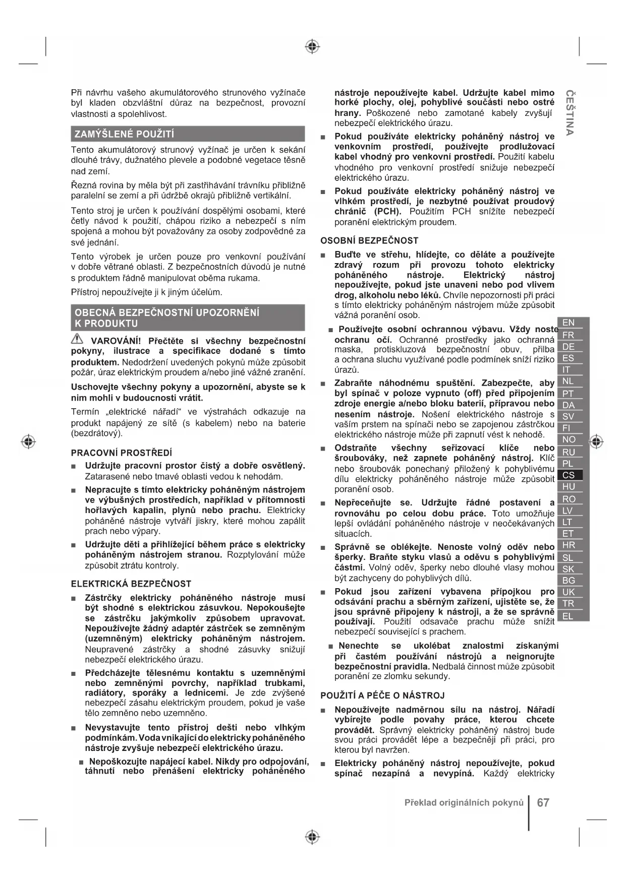 ■ Nepracujte se strojem na příliš příkrých svazích. Tím omezíte riziko ztráty kontroly, uklouznutí a pádu, jež by mohlo vést k úrazu. ■ Při práci na svahu vždy dbejte na bezpečný postoj, pracujte napříč svahem, nikdy nahoru a dolů a obzvlášť si dávejte pozor při změně směru. Tím omezíte riziko ztráty kontroly, uklouznutí a pádu, jež by mohlo vést k úrazu. ■ Udržujte všechny části těla v dostatečné vzdálenosti od mechanismu, struny nebo kotouče, když je přístroj v chodu. Před spuštěním stroje se ujistěte, že se mechanismus, struna nebo kotouč ničeho nedotýkají. Chvilka nepozornosti při obsluze přístroje může vést k úrazu obsluhy nebo druhých osob. ■ Nepracujte se strojem nad úrovní pasu. Pomůže to zabránit nechtěnému kontaktu s mechanismem, strunou nebo kotoučem a umožní to lépe ovládat stroj i v neočekávaných situacích. ■ Při stříhání keřů nebo stromků, které jsou napjaty, si dávejte pozor na zpětný odraz. Po uvolnění napětí ve vláknech dřeva může keř nebo stromek zasáhnout obsluhu případně dostat stroj mimo kontrolu. ■ Buďte velmi opatrní při řezání malých větviček a křovin. Štíhlý pružný materiál se může zachytit kotouče a může šlehnout směrem k vám nebo vás vyvést z rovnováhy. ■ Udržujte přístroj pod kontrolou a nedotýkejte se vyžínací části, struny nebo kotouče a jiných nebezpečných pohyblivých částí, pokud jsou stále v pohybu. Tím omezíte riziko úrazu od pohyblivých částí. ■ Přenášejte stroj s vypnutým motorem a dále od těla. Správná manipulace s přístrojem sníží pravděpodobnost náhodného kontaktu s pohybujícím se mechanismem, strunou nebo kotoučem. ■ Používejte pouze náhradní mechanismus, struny, vyžínací hlavy a kotouče určené výrobcem. Nesprávné náhradní díly mohou zvýšit riziko poruchy a úrazu. ■ Při odstraňování zachyceného materiálu nebo provádění údržby musí být stoj vypnut a akumulátor musí být vyjmut. Náhodné spuštění přístroje během odstraňování zachyceného materiálu nebo provádění servisu může způsobit vážný úraz. DOPLŇUJÍCÍ BEZPEČNOSTNÍ VAROVÁNÍ ■ Před pracemi s nástrojem a po nárazu zkontrolujte možné poškození dílů. Pokud je spínač nebo nějaká část poškozena či opotřebována, musí se řádně opravit nebo vyměnit pověřeným servisním střediskem. ■ Malá čepel umístěná v ochranném krytu je určena k uřezání nově vytažené struny na správnou délku pro bezpečné použití a optimální výkon. Nůž je velmi ostrý. Nedotýkejte se nože, obzvláště během čištění přístroje. ■ Používejte pouze náhradní žací strunu od výrobce. Nepoužívejte žádné jiné sekací nástavec. ■ Zkontrolujte, zda je sekací doplněk řádně nainstalován a bezpečně upevněn. ■ Nikdy výrobek neprovozujte, dokud nejsou všechny chrániče, vodící plechy a rukojetě řádně a bezpečně připojeny. ■ Před každým použitím se ujistěte, že je řezací čepel řádně umístěna v bezpečnostním krytu a zajištěna. ■ Nástavec vyžínače udržujte pod výší pasu. ■ V případě nehody nebo poruchy okamžitě zařízení vypněte a vyjměte baterii. Výrobek můžete znovu používat až po důkladné kontrole autorizovaným servisním centrem. ■ K snížení rizika úrazu v důsledku styku s pohyblivými díly výrobek vždy vypněte, vyjměte baterii a nechte oboje vychladnout. Ujistěte se, že se zastavily všechny pohyblivé díly: ● před servisem ● před čištěním usazenin ● před kontrolou, čištěním nebo prací na nástroji, ● před výměnou příslušenství ● po nárazu na cizí předmět ● je-li ponechán výrobek bez dozoru ● při údržbě ● pokud stroj začne abnormálně vibrovat ■ Zkontrolujte, zda jsou všechny bezpečnostní kryty, rukojeti správně instalovány a v dobrém stavu. ■ Držte výrobek za rukojetě určené k držení a práci provádějte po omezenou dobu. ■ Vyhýbejte se při sekání odmršťování předmětů. Odstraňte z pracovní oblasti předměty jako malé kameny, štěrk a další cizí předměty před započetím práce. Do žacího nástroje se mohou namotat dráty nebo struna. ■ Vždy zajistěte, aby ventilační otvory nebyly ničím zataraseny. ■ Poranění mohou být způsobena, či zhoršena, prodlouženým používáním nástroje. Používáte-li přístroj delší dobu, zajišťujte pravidelné přestávky. ■ Přístroj provozujte pouze při teplotách mezi 0 °C a 40 °C. ■ Přístroj skladujte v místě s teplotou prostředí mezi 0 °C a 40 °C. DOPLŇUJÍCÍ BEZPEČNOSTNÍ UPOZORNĚNÍ K BATERII Ke snížení rizika požáru, úrazu a poškození výrobku v důsledku zkratu nikdy nenořte přístroj, baterii ani nabíječku do tekutiny a nedovolte, aby do nich tekutina vnikla. Korodující nebo vodivé kapaliny, jako je slaná voda, určité chemikálie a bělicí prostředky nebo výrobky, které obsahují bělidlo, mohou způsobit zkrat. ■ Baterii dobíjejte na místě s teplotou prostředí mezi 10 °C a 38 °C. ■ Baterii skladujte na místě s teplotou prostředí mezi 0 °C a 20°C. ■ Baterii používejte na místě s okolní teplotou 0 °C a 40 °C.