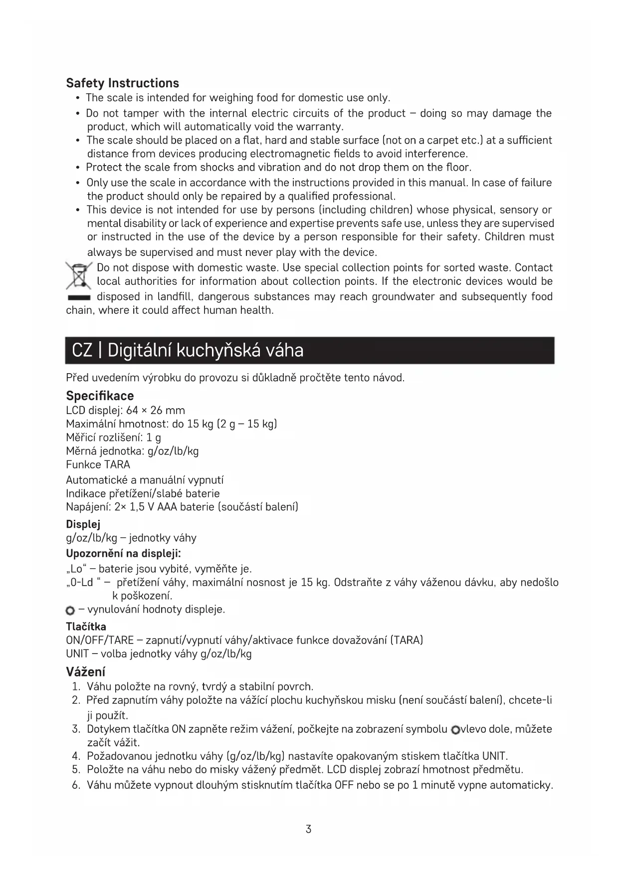 - This device is not intended for use by persons (including children) whose physical, sensory or mental disability or lack of experience and expertise prevents safe use, unless they are supervised or instructed in the use of the device by a person responsible for their safety. Children must always be supervised and must never play with the device. Do not dispose with domestic waste. Use special collection points for sorted waste. Contact local authorities for information about collection points. If the electronic devices would be disposed in landll, dangerous substances may reach groundwater and subsequently food chain, where it could aect human health. CZ | Digitální kuchyňská váha Před uvedením výrobku do provozu si důkladně pročtěte tento návod. Specikace LCD displej: 64 × 26 mm Maximální hmotnost: do 15 kg (2 g – 15 kg) Měřicí rozlišení: 1 g Měrná jednotka: g/oz/lb/kg Funkce TARA Automatické amanuální vypnutí Indikace přetížení/slabé baterie Napájení: 2× 1,5 VAAA baterie (součástí balení) Displej g/oz/lb/kg – jednotky váhy Upozornění na displeji: „Lo“ – baterie jsou vybité, vyměňte je. „0-Ld “ – přetížení váhy, maximální nosnost je 15 kg. Odstraňte zváhy váženou dávku, aby nedošlo kpoškození. – vynulování hodnoty displeje. Tlačítka ON/OFF/TARE – zapnutí/vypnutí váhy/aktivace funkce dovažování (TARA) UNIT – volba jednotky váhy g/oz/lb/kg Vážení