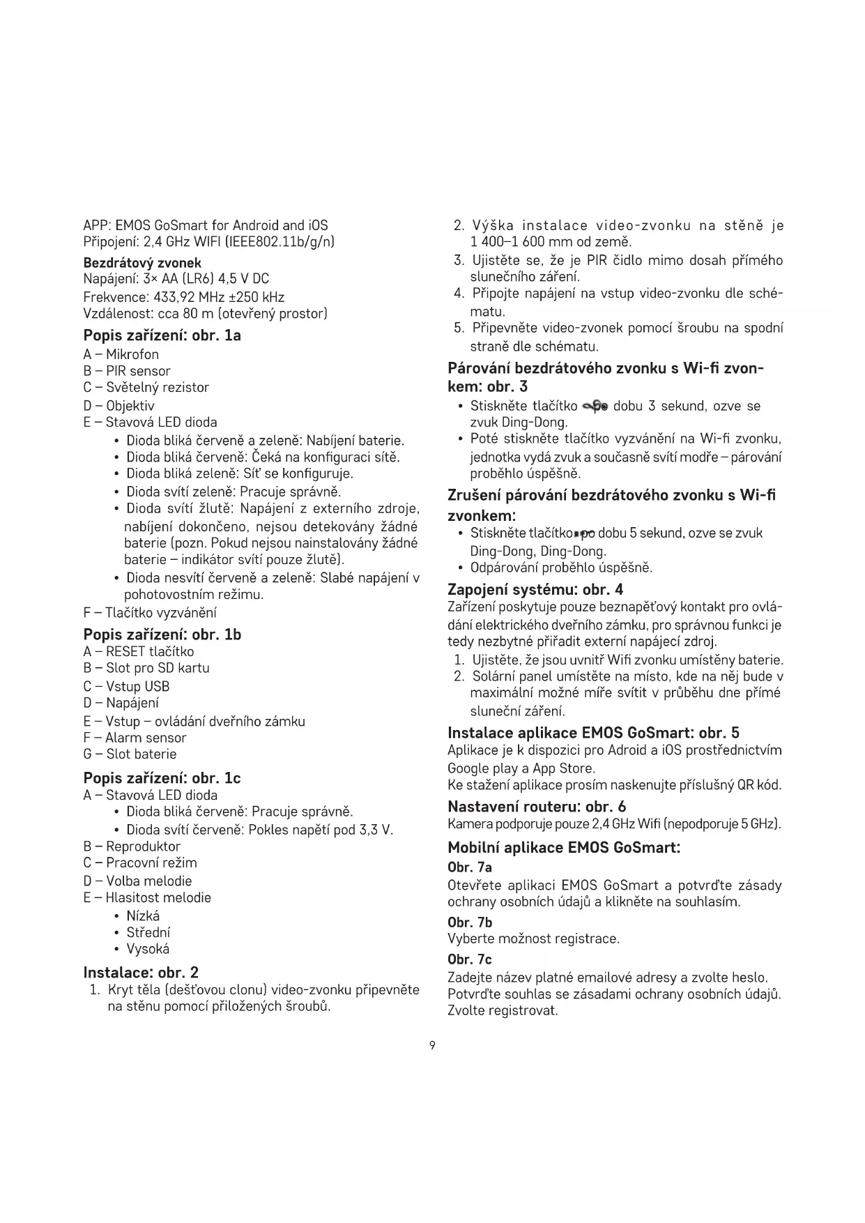 maximální možné míře svítit v průběhu dne přímé sluneční záření. Instalace aplikace EMOS GoSmart: obr. 5 Aplikace je k dispozici pro Adroid a iOS prostřednictvím Google play a App Store. Ke stažení aplikace prosím naskenujte příslušný QR kód. Nastavení routeru: obr. 6 Kamera podporuje pouze 2,4 GHz Wi (nepodporuje 5 GHz). Mobilní aplikace EMOS GoSmart: Obr. 7a Otevřete aplikaci EMOS GoSmart a potvrďte zásady ochrany osobních údajů a klikněte na souhlasím. Obr. 7b Vyberte možnost registrace. Obr. 7c Zadejte název platné emailové adresy a zvolte heslo. Potvrďte souhlas se zásadami ochrany osobních údajů. Zvolte registrovat.10 Obr. 8a Vyberte možnost přidat zařízení. Obr. 8b Zvolte danou kategorii produktů. Obr. 8c Zvolte daný typ produktu. Obr. 8d Zapněte zařízení do el. sítě. Obr. 8e Ujistěte se, že LED dioda na zařízení bliká. Potvrďte tlačítkem další. Obr. 8f Zadejte název Wi sítě a heslo. Potvrďte tlačítkem další. Obr. 8g Na displeji Vašeho mobilního zařízení se objeví QR kód. QR kód umístěte před objektiv kamerové jednotky. Potvrďte, že jste slyšeli zvukový signál pro úspěšné spárování. Obr. 8h Proběhne automatické vyhledání zařízení. Obr. 8i Zařízení je vyhledáno. Potvrďte tlačítkem hotovo. Konektivita: Wi-Fi 2,4 GHz IEEE 802.11b/g/n Kmitočtové pásmo: 2,400–2,4835 GHz Nevyhazujte elektrické spotřebiče jako netříděný komunální odpad, použijte sběrná místa tříděného odpadu. Pro aktuální informace o sběrných místech kontaktujte místní úřady. Pokud jsou elektrické spotře- biče uložené na skládkách odpadků, nebezpečné látky mohou prosakovat do podzemní vody a dostat se do potravního řetězce a poškozovat vaše zdraví. Tímto EMOS spol. s r.o. prohlašuje, že typ rádiového za- řízení H4030 je v souladu se směrnicí 2014/53/EU. Úplné znění EU prohlášení o shodě je k dispozici na těchto in- ternetových stránkách http://www.emos.eu/download. SK | IP dverová kamerová jednotka Obsah balenia: Wi zvonček Kryt tela (dažďová clona) Bezdrôtový zvonček Solárny panel Batéria Li-ion 18650 Prepojovací kábel Inštalačný materiál – skrutky Manuál Technická špecikácia Wi zvonček Napájanie: 2 200 mAh Solárny panel: 1,5 W Rozlíšenie: 1 920 × 1 080 Objektív: 2,69 mm JX-F37 Objektív uhol: 110° PIR vzdialenosť: do 4 m Úložisko: SD card (max. 64 gb), Cloud storage Stupeň krytia: IP44 Maximálny počet užívateľov: 10 APP: EMOS GoSmart for Android and iOS Pripojenie: 2,4 GHz WIFI (IEEE802.11b/g/n) Bezdrôtový zvonček Napájanie: 3× AA (LR6) 4,5 V DC Frekvencia: 433,92 MHz ±250 kHz Vzdialenosť: cca 80 m (otvorený priestor) Popis zariadenia: obr. 1a A – Mikrofón B – PIR senzor C – Svetelný rezistor D – Objektív E – Stavová LED dióda