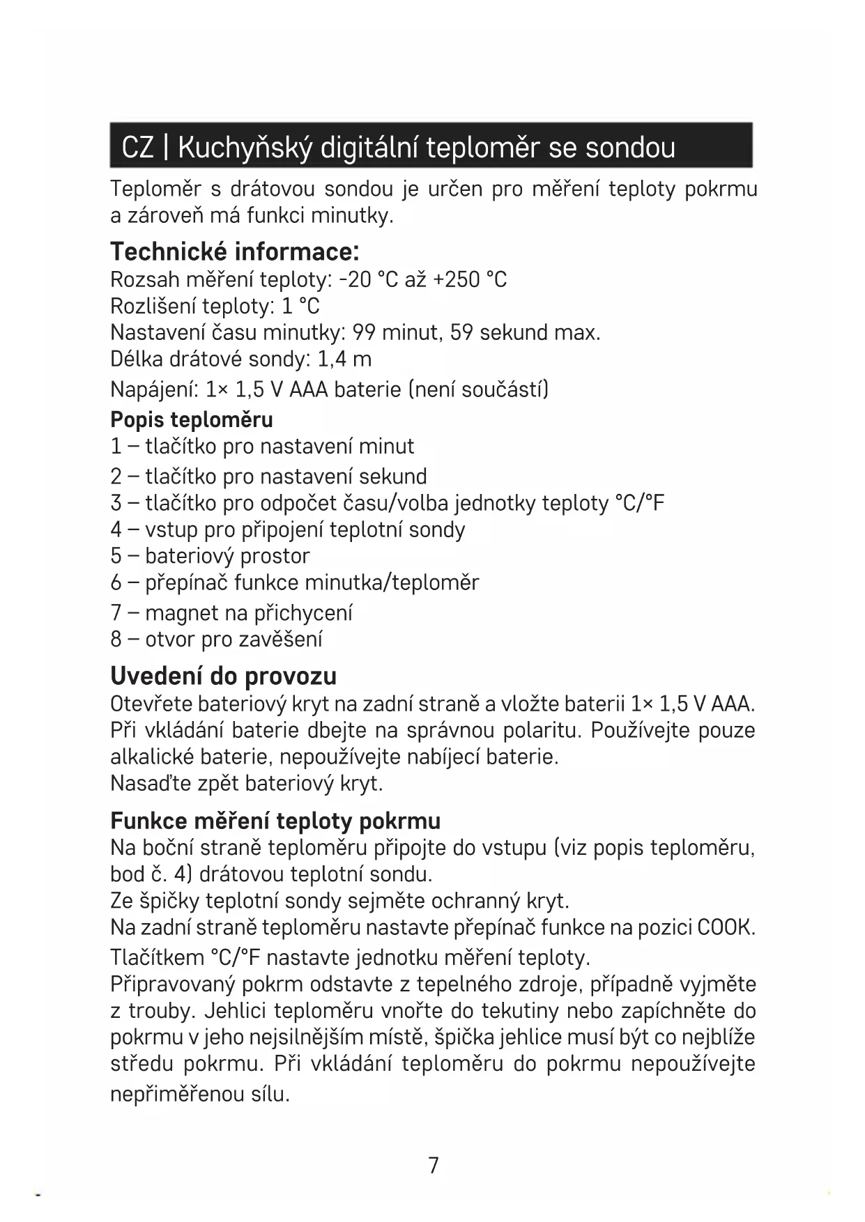- Do not disassemble the battery or expose it to re. Return used batteries to a designated site for collection of such waste or to the store in which it was purchased. This device is not intended for use by persons (including children) whose physical, sensory or mental disability or whose lack of experi- ence or knowledge prevents them from using it safely. Such persons should be instructed as to how to use the device and supervised by a person responsible for their safety. Children must always be supervised and must never play with the device. A declaration of conformity has been issued for this product.6 7 CZ | Kuchyňský digitální teploměr se sondou Teploměr s drátovou sondou je určen pro měření teploty pokrmu azároveň má funkci minutky. Technické informace: Rozsah měření teploty: -20°C až +250°C Rozlišení teploty: 1°C Nastavení času minutky: 99 minut, 59 sekund max. Délka drátové sondy: 1,4 m Napájení: 1× 1,5 V AAA baterie (není součástí) Popis teploměru 1 – tlačítko pro nastavení minut 2 – tlačítko pro nastavení sekund 3 – tlačítko pro odpočet času/volba jednotky teploty °C/°F 4 – vstup pro připojení teplotní sondy 5 – bateriový prostor 6 – přepínač funkce minutka/teploměr 7 – magnet na přichycení 8 – otvor pro zavěšení Uvedení do provozu Otevřete bateriový kryt na zadní straně a vložte baterii 1× 1,5 V AAA. Při vkládání baterie dbejte na správnou polaritu. Používejte pouze alkalické baterie, nepoužívejte nabíjecí baterie. Nasaďte zpět bateriový kryt. Funkce měření teploty pokrmu Na boční straně teploměru připojte do vstupu (viz popis teploměru, bod č. 4) drátovou teplotní sondu. Ze špičky teplotní sondy sejměte ochranný kryt. Na zadní straně teploměru nastavte přepínač funkce na pozici COOK. Tlačítkem °C/°F nastavte jednotku měření teploty. Připravovaný pokrm odstavte z tepelného zdroje, případně vyjměte z trouby. Jehlici teploměru vnořte do tekutiny nebo zapíchněte do pokrmu v jeho nejsilnějším místě, špička jehlice musí být co nejblíže středu pokrmu. Při vkládání teploměru do pokrmu nepoužívejte nepřiměřenou sílu.8 Vyčkejte několik sekund, dokud se rostoucí nebo klesající teplota na LCD displeji nezastaví. Naměřená teplota bude zobrazena vlevo na displeji v poli THERMO TEMP. Teplotní alarm Teploměr umožňuje nastavit teplotní alarm při dosažení požadované teploty. V režimu „Funkce měření teploty pokrmu“ nastavte tlačítky MIN aSEC požadovanou teplotu pokrmu (-20°C až +250°C, rozlišení 1°C). Nastavená teplota bude zobrazena vpravo na displeji v poli SET TEMP. Jakmile teplota pokrmu dosáhne zvolené teploty, teploměr začne pípat a bude zobrazena ikona zvonku. Pípání přerušíte odpojením sondy nebo přepnutím na funkci minutky (TIMER). Teplotní sondu neponechávejte během teplotní úpravy vloženou vpokrmu, ihned po ukončení měření ji vyjměte. Funkce minutka Na zadní straně teploměru nastavte přepínač funkce na pozici TIMER.