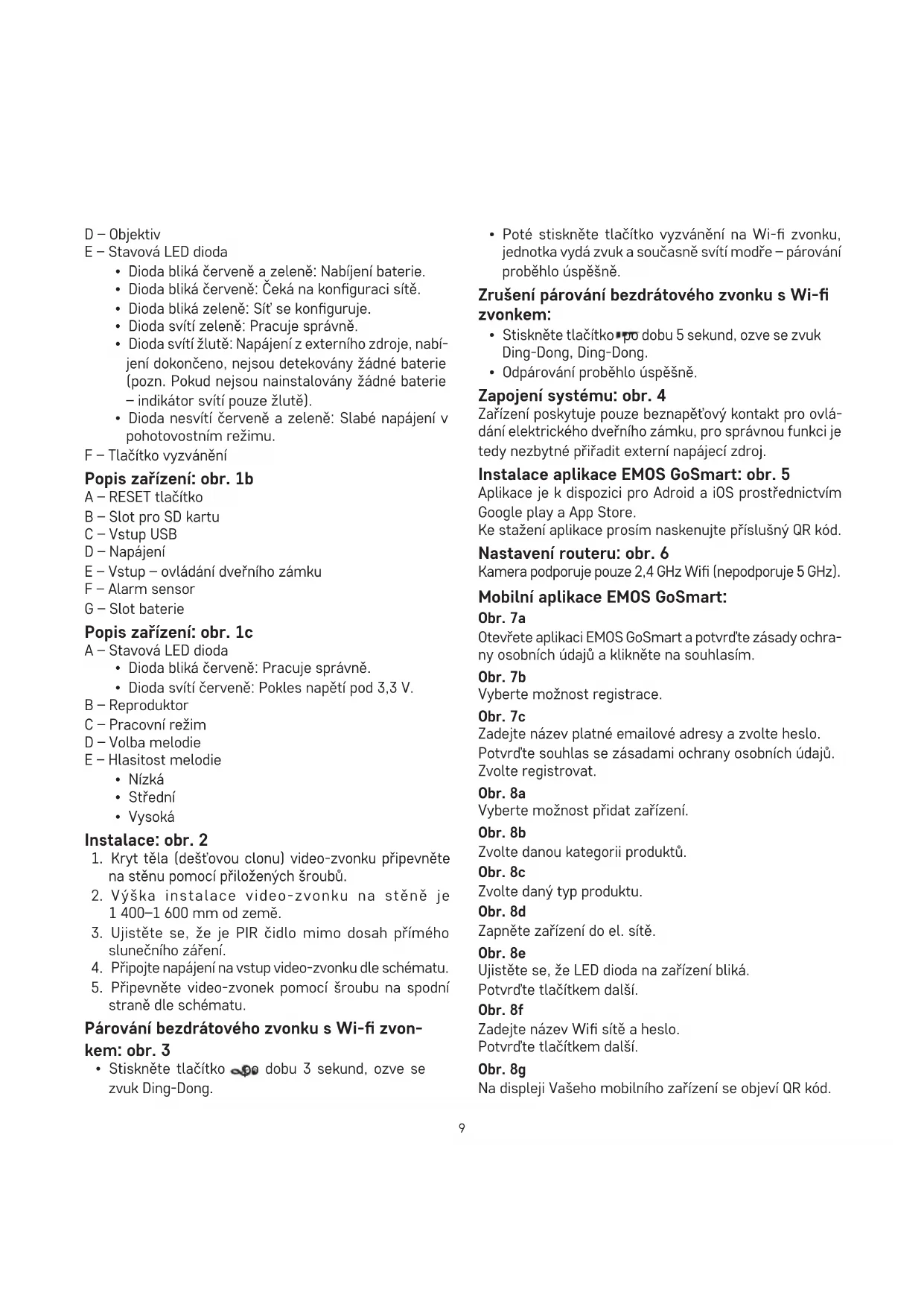 - Odpárování proběhlo úspěšně. Zapojení systému: obr. 4 Zařízení poskytuje pouze beznapěťový kontakt pro ovlá- dání elektrického dveřního zámku, pro správnou funkci je tedy nezbytné přiřadit externí napájecí zdroj. Instalace aplikace EMOS GoSmart: obr. 5 Aplikace je k dispozici pro Adroid a iOS prostřednictvím Google play a App Store. Ke stažení aplikace prosím naskenujte příslušný QR kód. Nastavení routeru: obr. 6 Kamera podporuje pouze 2,4 GHz Wi (nepodporuje 5 GHz). Mobilní aplikace EMOS GoSmart: Obr. 7a Otevřete aplikaci EMOS GoSmart a potvrďte zásady ochra- ny osobních údajů a klikněte na souhlasím. Obr. 7b Vyberte možnost registrace. Obr. 7c Zadejte název platné emailové adresy a zvolte heslo. Potvrďte souhlas se zásadami ochrany osobních údajů. Zvolte registrovat. Obr. 8a Vyberte možnost přidat zařízení. Obr. 8b Zvolte danou kategorii produktů. Obr. 8c Zvolte daný typ produktu. Obr. 8d Zapněte zařízení do el. sítě. Obr. 8e Ujistěte se, že LED dioda na zařízení bliká. Potvrďte tlačítkem další. Obr. 8f Zadejte název Wi sítě a heslo. Potvrďte tlačítkem další. Obr. 8g Na displeji Vašeho mobilního zařízení se objeví QR kód.10 QR kód umístěte před objektiv kamerové jednotky. Potvrďte, že jste slyšeli zvukový signál pro úspěšné spárování. Obr. 8h Proběhne automatické vyhledání zařízení. Obr. 8i Zařízení je vyhledáno. Potvrďte tlačítkem hotovo. Konektivita: Wi-Fi 2,4 GHz IEEE 802.11b/g/n Kmitočtové pásmo: 2,400–2,4835 GHz Nevyhazujte elektrické spotřebiče jako netříděný komunální odpad, použijte sběrná místa tříděného odpadu. Pro aktuální informace o sběrných místech kontaktujte místní úřady. Pokud jsou elektrické spotřebi- če uložené na skládkách odpadků, nebezpečné látky mohou prosakovat do podzemní vody a dostat se do po- travního řetězce a poškozovat vaše zdraví. Tímto EMOS spol. s r.o. prohlašuje, že typ rádiového zařízení H4031 je v souladu se směrnicí 2014/53/EU. Úplné znění EU prohlášení o shodě je k dispozici na těchto internetových stránkách http://www.emos.eu/download. SK | IP dverová kamerová jednotka Obsah balenia: Wi zvonček Kryt tela (dažďová clona) Bezdrátový zvonček Napájací zdroj Prepojovací kábel Inštalačný materiál – skrutky Manuál Technická špecikácia Wi zvonček Napájanie: DC 12 V Rozlíšenie: 1 920 × 1 080 Objektív: 2,69 mm JX-F37 Objektív uhol: 110° PIR vzdialenosť: do 4 m Úložisko: SD card (max. 64 Gb), Cloud storage Stupeň krytia: IP44 Maximálny počet užívateľov: 10 APP: EMOS GoSmart for Android and iOS Pripojenie: 2,4 GHz WIFI (IEEE802.11b/g/n) Bezdrôtový zvonček Napájanie: 3× AA (LR6) 4,5 V DC Frekvencia: 433,92 MHz ±250 kHz Vzdialenosť: cca 80 m (otvorený priestor) Popis zariadenia: obr. 1a A – Mikrofón B – PIR senzor C – Svetelný rezistor D – Objektív E – Stavová LED dióda