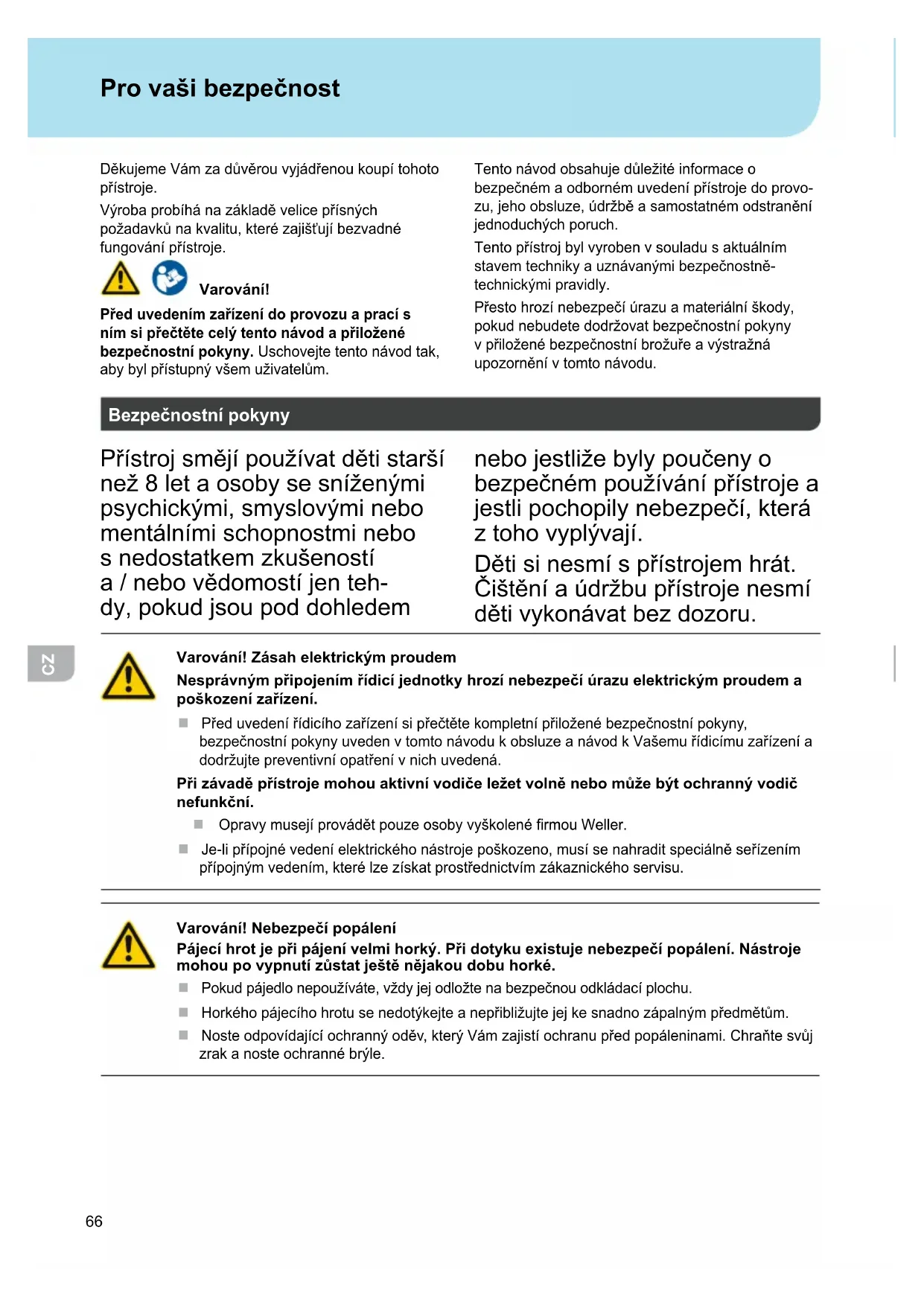 Pro vaši bezpečnost DěkujemeVámzadůvěrouvyjádřenoukoupítohoto přístroje. Výrobaprobíhánazákladěvelicepřísných požadavkůnakvalitu,kterézajišťujíbezvadné fungovánípřístroje. Varování! Před uvedením zařízení do provozu a prací s ním si přečtěte celý tento návod a přiložené bezpečnostní pokyny. Uschovejtetentonávodtak, abybylpřístupnývšemuživatelům. Tentonávodobsahujedůležitéinformaceo bezpečnémaodbornémuvedenípřístrojedoprovo- zu,jehoobsluze,údržběasamostatnémodstranění jednoduchýchporuch. Tentopřístrojbylvyrobenvsouladusaktuálním stavemtechnikyauznávanýmibezpečnostně- technickýmipravidly. Přestohrozínebezpečíúrazuamateriálníškody, pokudnebudetedodržovatbezpečnostnípokyny vpřiloženébezpečnostníbrožuřeavýstražná upozorněnívtomtonávodu. Bezpečnostní pokyny Přístrojsmějípoužívatdětistarší než8letaosobysesníženými psychickými,smyslovýminebo mentálnímischopnostminebo snedostatkemzkušeností a/nebovědomostíjenteh- dy,pokudjsoupoddohledem nebojestližebylypoučenyo bezpečnémpoužívánípřístrojea jestlipochopilynebezpečí,která ztohovyplývají. Dětisinesmíspřístrojemhrát. Čištěníaúdržbupřístrojenesmí dětivykonávatbezdozoru. Varování! Zásah elektrickým proudem Nesprávným připojením řídicí jednotky hrozí nebezpečí úrazu elektrickým proudem a poškození zařízení. Předuvedenířídicíhozařízenísipřečtětekompletnípřiloženébezpečnostnípokyny, bezpečnostnípokynyuvedenvtomtonávodukobsluzeanávodkVašemuřídicímuzařízenía dodržujtepreventivníopatřenívnichuvedená. Při závadě přístroje mohou aktivní vodiče ležet volně nebo může být ochranný vodič nefunkční. OpravymusejíprovádětpouzeosobyvyškolenérmouWeller. Je-lipřípojnévedeníelektrickéhonástrojepoškozeno,musísenahraditspeciálněseřízením přípojnýmvedením,kterélzezískatprostřednictvímzákaznickéhoservisu. Varování! Nebezpečí popálení Pájecí hrot je při pájení velmi horký. Při dotyku existuje nebezpečí popálení. Nástroje mohou po vypnutí zůstat ještě nějakou dobu horké. Pokudpájedlonepoužíváte,vždyjejodložtenabezpečnouodkládacíplochu. Horkéhopájecíhohrotusenedotýkejteanepřibližujtejejkesnadnozápalnýmpředmětům. Nosteodpovídajícíochrannýoděv,kterýVámzajistíochranupředpopáleninami.Chraňtesvůj zrakanosteochrannébrýle.67
