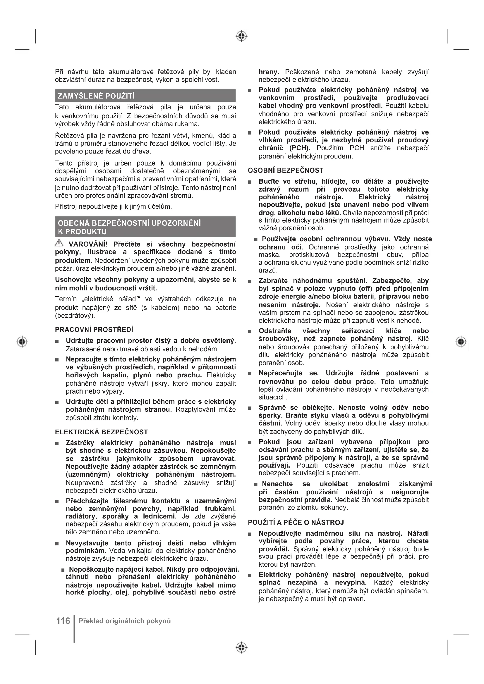 ■ Udržujte všechny části těla v dostatečné vzdálenosti od řetězu, když řetězová pila pracuje. Před spuštěním řetězové pily zkontrolujte, zda se řetěz pily nedotýká žádného předmětu. Chvíle nepozornosti při práci s řetězovou pilou může způsobit zamotání vašeho oděvu nebo těla do řetězu pily. ■ Vždy držte řetězovou pilu pravou rukou na zadní rukojeti a levou rukou na přední rukojeti. Držení řetězové pily v opačném umístění rukou se zvyšuje nebezpečí poranění osob a nemělo by se nikdy používat. ■ Pilu držte pouze na izolovaných plochách, protože její řetěz může přijít do styku se skrytými vodiči nebo s vlastním napájecím přívodem. Styk řetězové pily s fázovým vodičem může vystavit kovové části pilového řetězu napětí proti zemi a způsobit uživateli úraz elektrickým proudem. ■ Noste ochranu očí Je doporučeno používat prostředky na ochranu sluchu, hlavy, rukou a nohou. Odpovídající ochranné prostředky snižují riziko úrazu od odletujících odřezků a náhodného styku s řetězem pily. ■ Pilu nepoužívejte, pokud jste na stromě, na žebříku, na střeše nebo na jiné nestabilní opoře. Používání pily tímto způsobem může způsobit vážný úraz. ■ Vždy udržujte řádné postavení a obsluhujte pilu pouze při postavení na pevné, bezpečné a rovné ploše. Kluzký nebo nestabilní povrch může způsobit ztrátu rovnováhy nebo kontroly nad pilou. ■ Když řežete větev, která je napnuta, buďte ve střehu před zpětným švihem. Pokud se uvolní pnutí ve vláknech dřeva může napružená větev udeřit obsluhu anebo způsobit ztrátu kontroly nad řetězovou pilou. ■ Buďte velmi opatrní při řezání malých větviček a křovin. Mohou se zachytit o zuby řetězu a být vymrštěny směrem k vám a narušit tak vaši rovnováhu. ■ Noste řetězovou pilu za přední rukojeť ve vypnutém stavu a směrem od vašeho těla. Pokud řetězovou pilu přepravujete nebo ukládáte, vždy připevněte kryt vodící lišty. Správné držení řetězové pily sníží pravděpodobnost náhodného dotyku s pohybujícím se řetězem pily. ■ Dodržujte pokyny k promazávání, napínání řetězu a výměně lišty a řetězu. Nesprávně upnutý nebo namazaný řetěz může buď způsobit nebo zvýšit zpětný vrh. ■ Řezejte pouze dřevo. Nepoužívejte řetězovou pilu pro účely, pro které nebyla navržena. Například nepoužívejte pilu k řezání kovů, plastů, zdiva neboli118 Překlad originálních pokynů nedřevěných stavebních materiálů. Použití řetězové pily pro práce jiné, než zamýšlené, by mohlo mít za následek nebezpečnou situaci. ■ Neporážejte strom, dokud neznáte všechna související rizika a způsob jejich odstranění. Při kácení stromu může dojít k úrazu obsluhy pily nebo přihlížejících osob. ■ Při odstraňování zachyceného materiálu, skladování a provádění servisu dodržujte všechny pokyny. Vypínač musí být v poloze vypnuto a baterie vyjmuty. Náhodné spuštění pily během odstraňování zachyceného materiálu nebo provádění servisu může způsobit úraz. PŘÍČINY A PREVENCE ZPĚTNÉMU VRHU: Pokud konec vodící lišty narazí na cizí předmět nebo dojde k zablokování řetězu při řezání, existuje nebezpečí zpětnéhu vrhu. Dotyk vrcholem vodící lišty může v některých případech způsobit náhlou zpětnou reakci, což je vyhození vodící lišty nahoru a zpět směrem k obsluze. Sevření řetězu pily na horní části vodící lišty může vodící lištu rychle zatlačit zpět směrem k obsluze. Ve všech uvedených případech může obsluha pily ztratit kontrolu nad nářadím a způsobit si vážný úraz. Nespoléhejte pouze na ochranné prvky řetězové pily. Při obsluze řetězové pily je třeba dodržovat opatření k zajištění bezpečností a ochrany zdraví při práci. Důsledkem nesprávného použití řetězové pily anebo nesprávného pracovního postupu či podmínek může být zpě tný ráz, kterému se lze vyhnout dodržováním níže uvedených opatření: ■ Udržujte pevný úchop, palce a prsty obepínají rukojeti řetězové pily, oběma rukama na řetězové pile a rozestavte své tělo a ruce tak, abyste odolávali silám zpětného vrhu. Síly zpětného vrhu mohou být ovládány obsluhou, pokud provede správná opatření. Řetězovou pilu neopouštějte. ■ Nepřeceňujte se a neřežte nad úrovní ramen. Toto pomáhá zabránit neúmyslnému kontaktu s vrcholem vodící lišty a umožňuje lepší ovládání řetězové pily v neočekávaných situacích. ■ Používejte pouze náhradní vodicí lišty a pilové řetězy určené výrobcem. Nesprávná vodicí lišta nebo pilový řetěz může způsobit přetržení řetězu nebo zpětný náraz. ■ Dodržujte pokyny výrobce při ostření a údržbě řetězu. Zmenšení výšky hloubkoměru může vést ke zvýšenému zpětnému vrhu. DOPLŇUJÍCÍ BEZPEČNOSTNÍ VAROVÁNÍ ■ Velmi doporučujeme účast na profesionálně organizovaném bezpečnostním kurz o používání, preventivních opatřeních, první pomoci a údržbě řetězových pil. Tyto pokyny uschovejte pro příští použití. ■ Řetězové pily jsou velmi nebezpečné nástroje. Nehody způsobené používáním řetězové pily často končí ztrátou končetiny či smrtí. Padající větve, kácené stromy i odvalující se polena mohou usmrtit. Napadené nebo shnilé dřevo představuje další nebezpečí. Měli byste zhodnotit své schopnosti k bezpečnému dokončení úkolu. V případě pochyb neváhejte profesionální dřevorubce. ■ Neodřezávejte výhonky ani křoviny s malým průměrem (do 75 mm). ■ Při prvním použití přístroje se doporučuje nácvik řezání polen na „koze“ nebo podpěrném stojanu. ■ Plocha pracovn