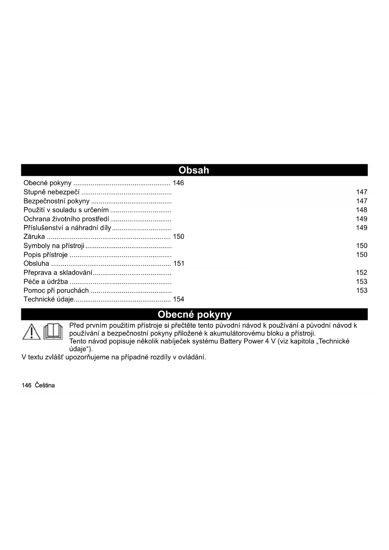 - Technické údaje Čeština 147 Stupně nebezpečí NEBEZPEČÍ ● Upozornění na bezprostředně hrozící nebezpečí, které vede k těžkým úrazům nebo usmrcení. 몇 VAROVÁNÍ ● Upozornění na možnou nebezpečnou situaci, která může vést k těžkým úrazům nebo usmrcení. 몇 UPOZORNĚNÍ ● Upozornění na možnou nebezpečnou situaci, která může vést k lehkým úrazům. POZOR ● Upozornění na možnou nebezpečnou situaci, která může vést ke vzniku věcných škod. Bezpečnostní pokyny NEBEZPEČÍ ● Nebezpečí výbuchu. Nepoužívejte k nabíjení nenabíjecích baterií. ● Nabíječku používejte pouze k nabíjení schválených akumulátorových bloků. ● Zkontrolujte před každým zahájením provozu nabíječku, nabíjecí šachtu a síťový adaptér, zda nejsou poškozené. Nepoužívejte poškozená zařízení. V případě poškození přístroj vyměňte. ● Před každým použitím zkontrolujte připojovací kabel, zda není poškozený. Nepoužívejte přístroje s poškozeným připojovacím kabelem. V případě poškození kontaktujte společnost KÄRCHER nebo některého z našich servisních partnerů. ● Nenabíjejte poškozené nebo neúplně funkční akumulátorové bloky. Poškozené nebo nefunkční akumulátorové bloky okamžitě zlikvidujte podle platných předpisů pro přepravu a likvidaci odpadu. ● Nepoužívejte nabíječku ve výbušném prostředí nebo v blízkosti hořlavých předmětů. ● Neponořujte zařízení do vody ani jej nedržte pod proudem vody. ● Nenabíjejte akumulátorový blok bez dozoru. Během nabíjení pravidelně kontrolujte stav akumulátorového bloku a nabíječky. ● Pokud během nabíjení zaznamenáte poruchu, neobvyklý zápach nebo zahřívání, odpojte nabíječku ze sítě a akumulátorový blok od nabíječky. Akumulátorový blok a nabíječku okamžitě zlikvidujte a dodržujte příslušné předpisy pro přepravu a likvidaci odpadu.148 Čeština 몇 VAROVÁNÍ ● Zkontrolujte shodu síťového napětí s napětím uvedeným na typovém štítku nabíječky. ● Ochraňte připojovací kabel a síťový adaptér před horkem, ostrými hranami, olejem a pohyblivými částmi přístroje. ● Neotevírejte nabíječku. Opravy svěřujte pouze odbornému personálu. ● Před čištěním nabíječky nebo prováděním údržby vytáhněte síťový adaptér ze síťové zásuvky. ● Osoby se sníženými fyzickými, smyslovými nebo duševními schopnostmi nebo s nedostatečnými zkušenostmi a znalostmi smí používat přístroj pouze tehdy, když jsou pod odborným dohledem nebo pokud byly poučeny osobou zodpovědnou za jejich bezpečnost o bezpečném používání přistroje a rozumí rizikům, které z toho vyplývají. ● S přístrojem si nesmí hrát děti. ● Dohlížejte na děti a zajistěte, aby si s přístrojem nehrály. ● Děti od nejméně 8 let smí pracovat s p řístrojem, pokud byly poučeny o používání osobou zodpovědnou za jejich bezpečnost nebo jsou pod jejím řádným dohledem a když porozuměly rizikům, která z používání vyplývají. ● Děti smí provádět čištění a uživatelskou údržbu pouze pod dohledem. 몇 UPOZORNĚNÍ ● Neprovozujte přístroj spolu s jinými přístroji napojenými na prodlužovací kabel s více zásuvkami. ● Síťový adaptér nevytahujte ze zásuvky za připojovací kabel. ● Nepoužívejte nabíječku v mokrém nebo znečištěném stavu. ● Nepokládejte akumulátorové bloky v mokrém nebo znečištěném stavu do nabíjecí šachty nabíječky. ● Nepoužívejte nabíječku v prašném prostředí. POZOR ● Nebezpečí zkratu. Chraňte nabíjecí kontakty před kovovými díly. ● Během provozu nabíječku nezakrývejte. ● Nepřenášejte nabíječku za připojovací kabel. ● Používejte nabíječku pouze v suchých vnitřních prostorách s nízkou vlhkostí vzduchu. Použití v souladu s určením 몇 UPOZORNĚNÍ Nebezpečí výbuchu! Zranění a škody v důsledku explodujícího akumulátorového bloku. Nenabíjejte vadné nebo ne zcela funkční akumulátorové bloky. Přestavby a změny bez autorizace výrobce jsou zakázány.Čeština 149 Jakékoliv jiné použití je nepřípustné. Za ohrožení nastalá v důsledku nepřípustného použití nese odpovědnost sám uživatel. Nabíjejte pouze akumulátorové bloky ze systému KÄRCHER Battery Power 4 V. Upozornění Vhodné akumulátorové bloky jsou označeny symbolem BP 4 V. Informace o napětí najdete na přístroji, na akumulátorovém bloku a na jejich typových štítcích. Ochrana životního prostředí Obalové materiály jsou recyklovatelné. Obaly prosím likvidujte ekologickým způsobem. Elektrické a elektronické přístroje obsahují hodnotné recyklovatelné materiály a často součásti, jako baterie, akumulátory nebo olej, které mohou při chybném zacházení nebo likvidaci představovat potenciální nebezpečí pro lidské zdraví nebo pro životní prostředí. Pro řádný provoz přístroje jsou však tyto součásti nezbytné. Přístroje označené tímto symbolem se nesmí likvidovat s domovním odpadem. Informace k obsaženým látkám (REACH) Aktuální informace k obsaženým látkám naleznete na stránkách: www.kaercher.com/REACH Příslušenství a náhradní díly Používejte pouze originální příslušenství a náhradní díly, které Vám zaručují bezpečný a bezporuchový provoz přístroje. Informace o příslušenství a náhradních dílech naleznete na stránkách www.kaercher.com.150 Čeština Záruka V každé zemi platí záruční podmínky vydané naší příslušnou odbytovou společností. Případné závady Vašeho přístroje odstraníme během záruční lhůty bezplatně, pokud jsou zaviněny vadou materiálu nebo výrobní vadou. Vzáručním případě se prosím obraťte s dokladem o koupi na Vašeho prodejce nebo na nejbližší autoriz