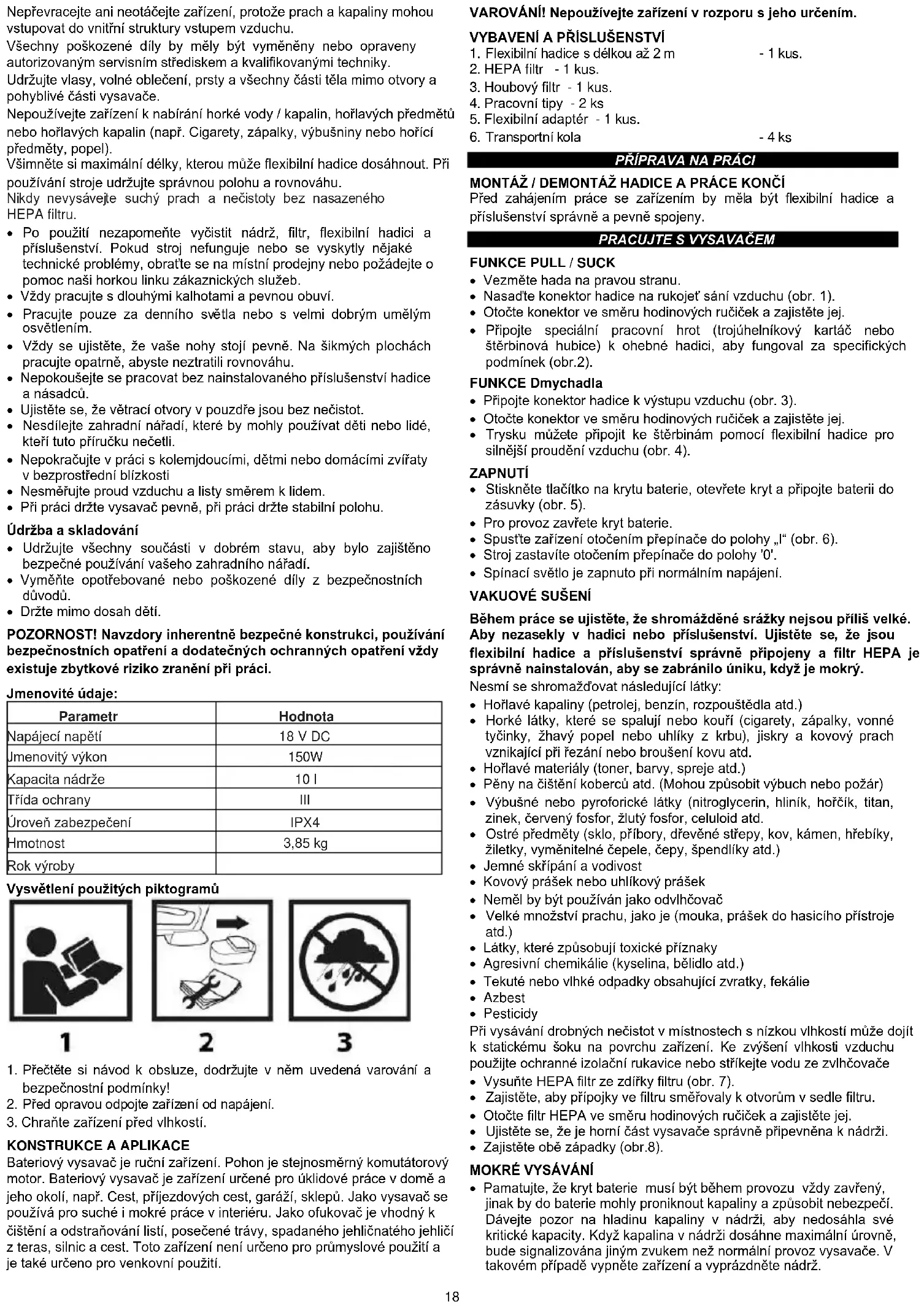 Bateriový vysavač je ruční zařízení. Pohon je stejnosměrný komutátorový motor. Bateriový vysavač je zařízení určené pro úklidové práce v domě a jeho okolí, např. Cest, příjezdových cest, garáží, sklepů. Jako vysavač se používá pro suché i mokré práce v interiéru. Jako ofukovač je vhodný k čištění a odstraňování listí, posečené trávy, spadaného jehličnatého jehličí z teras, silnic a cest. Toto zařízení není určeno pro průmyslové použití a je také určeno pro venkovní použití. VAROVÁNÍ! Nepoužívejte zařízení v rozporu s jeho určením.
