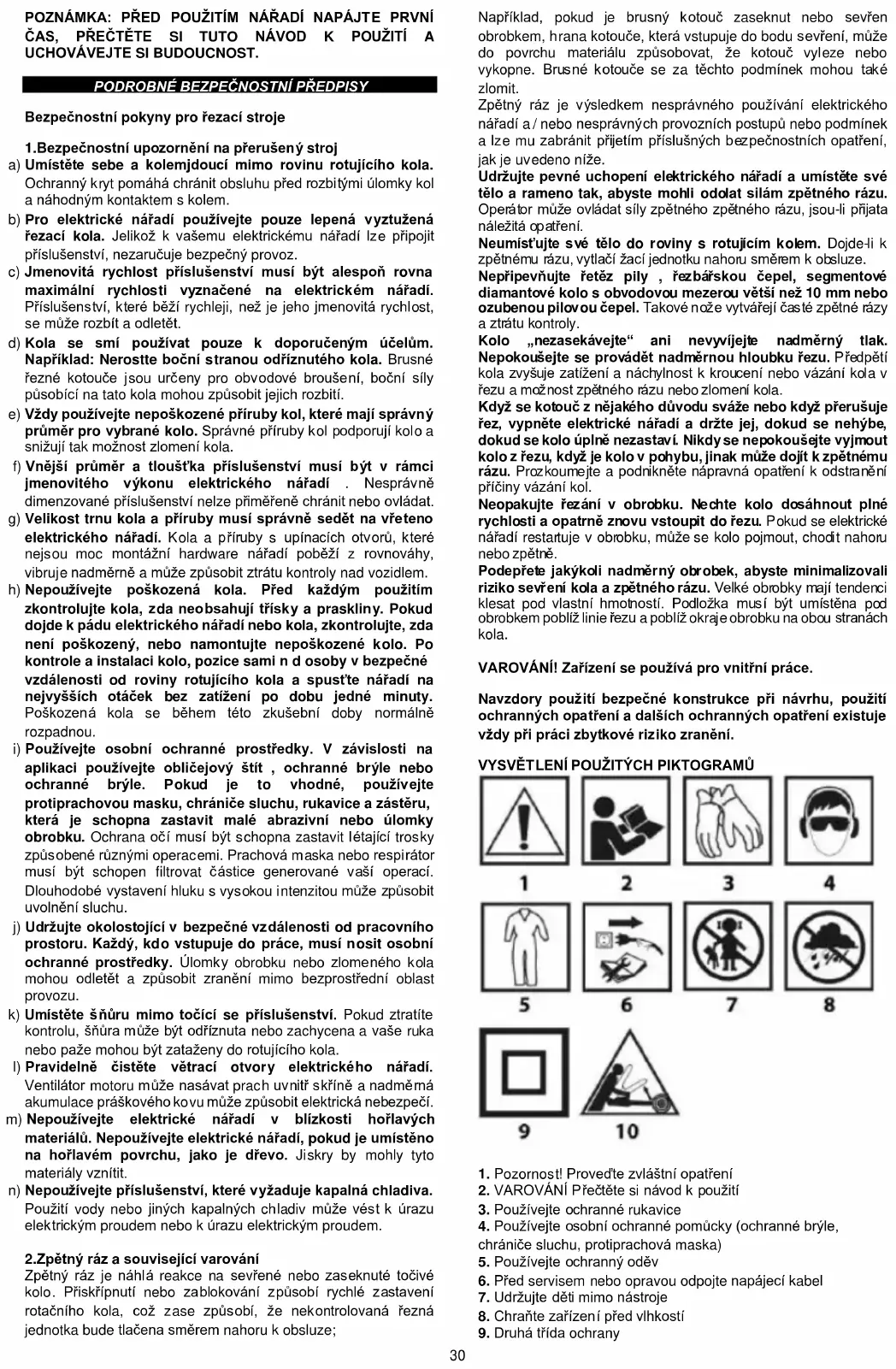 Bezpečnostní pokyny pro řezací stroje 1.Bezpečnostní upozornění na přerušený stroj a) Umístěte sebe a kolemjdoucí mimo rovinu rotujícího kola. Ochranný kryt pomáhá chránit obsluhu před rozbitými úlomky kol a náhodným kontaktem s kolem. b) Pro elektrické nářadí používejte pouze lepená vyztužená řezací kola. Jelikož k vašemu elektrickému nářadí lze připojit příslušenství, nezaručuje bezpečný provoz. c) Jmenovitá rychlost příslušenství musí být alespoň rovna maximální rychlosti vyznačené na elektrickém nářadí. Příslušenství, které běží rychleji, než je jeho jmenovitá rychlost, se může rozbít a odletět. d) Kola se smí používat pouze k doporučeným účelům. Například: Nerostte boční stranou odříznutého kola. Brusné řezné kotouče jsou určeny pro obvodové broušení, boční síly působící na tato kola mohou způsobit jejich rozbití. e) Vždy používejte nepoškozené příruby kol, které mají správný průměr pro vybrané kolo. Správné příruby kol podporují kolo a snižují tak možnost zlomení kola. f) Vnější průměr a tloušťka příslušenství musí být v rámci jmenovitého výkonu elektrického nářadí . Nesprávně dimenzované příslušenství nelze přiměřeně chránit nebo ovládat. g) Velikost trnu kola a příruby musí správně sedět na vřeteno elektrického nářadí. Kola a příruby s upínacích otvorů, které nejsou moc montážní hardware nářadí poběží z rovnováhy, vibruje nadměrně a může způsobit ztrátu kontroly nad vozidlem. h) Nepoužívejte poškozená kola. Před každým použitím zkontrolujte kola, zda neobsahují třísky a praskliny. Pokud dojde k pádu elektrického nářadí nebo kola, zkontrolujte, zda není poškozený, nebo namontujte nepoškozené kolo. Po kontrole a instalaci kolo, pozice sami n d osoby v bezpečné vzdálenosti od roviny rotujícího kola a spusťte nářadí na nejvyšších otáček bez zatížení po dobu jedné minuty. Poškozená kola se během této zkušební doby normálně rozpadnou.