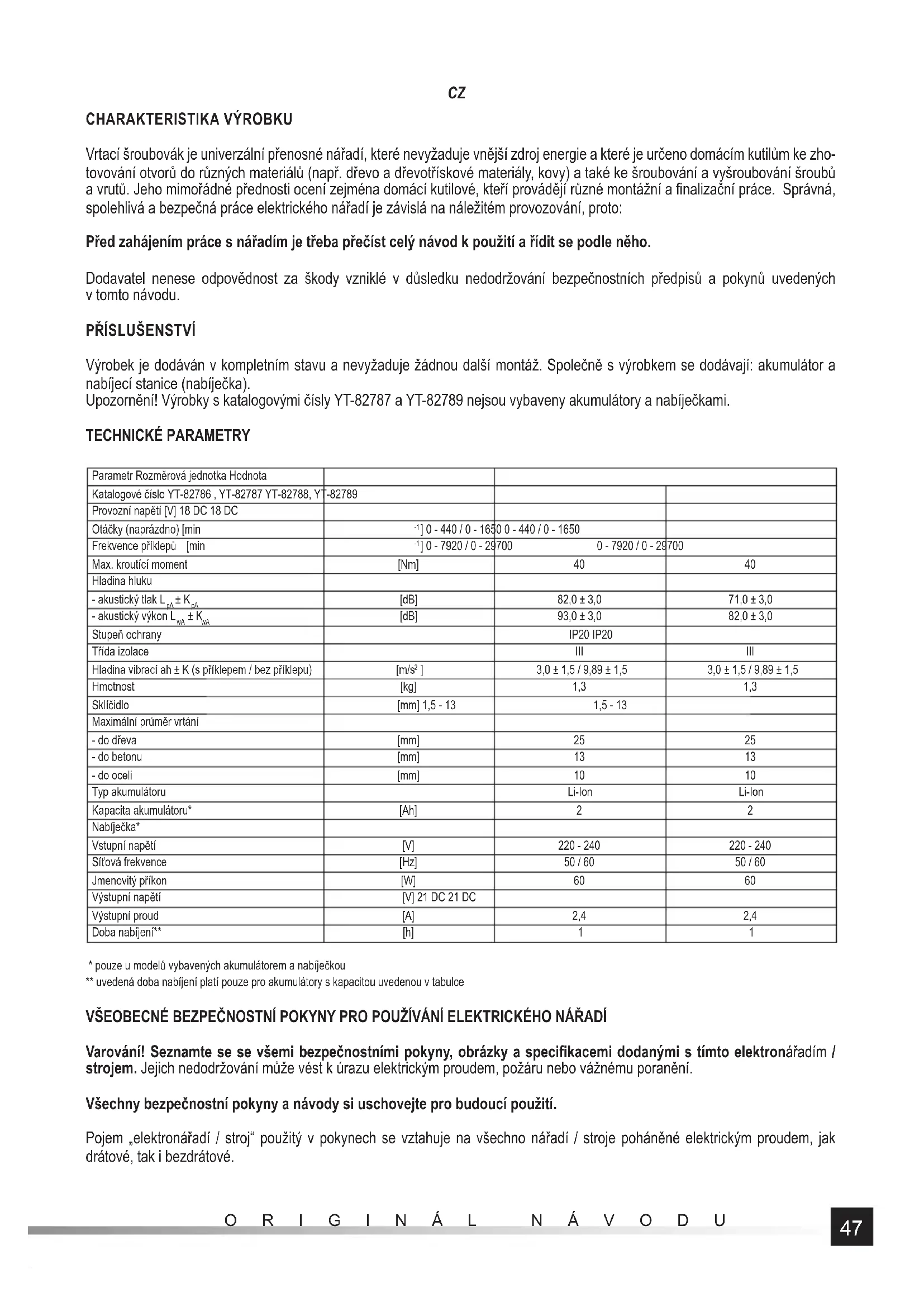 - pouze u modelů vybavených akumulátorem a nabíječkou ** uvedená doba nabíjení platí pouze pro akumulátory s kapacitou uvedenou v tabulce VŠEOBECNÉ BEZPEČNOSTNÍ POKYNY PRO POUŽÍVÁNÍ ELEKTRICKÉHO NÁŘADÍ Varování! Seznamte se se všemi bezpečnostními pokyny, obrázky a specifi kacemi dodanými s tímto elektronářadím / strojem. Jejich nedodržování může vést k úrazu elektrickým proudem, požáru nebo vážnému poranění. Všechny bezpečnostní pokyny a návody si uschovejte pro budoucí použití. Pojem „elektronářadí / stroj“ použitý v pokynech se vztahuje na všechno nářadí / stroje poháněné elektrickým proudem, jak drátové, tak i bezdrátové.48