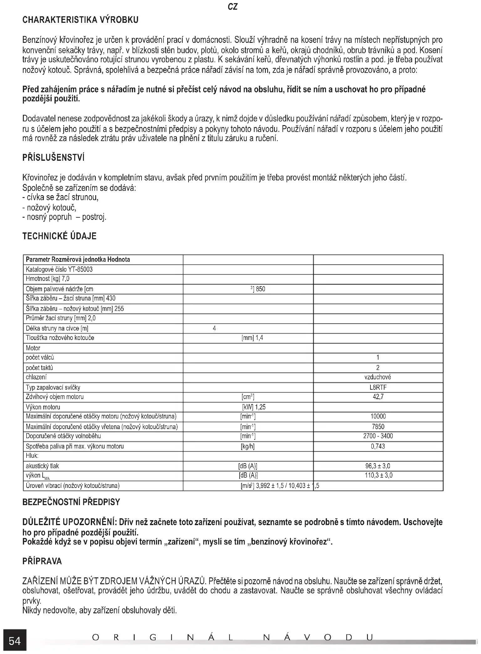 Křovinořez je dodáván v kompletním stavu, avšak před prvním použitím je třeba provést montáž některých jeho částí. Společně se zařízením se dodává: - cívka se žací strunou, - nožový kotouč, - nosný popruh – postroj. TECHNICKÉ ÚDAJE Parametr Rozměrová jednotka Hodnota Katalogové číslo YT-85003 Hmotnost [kg] 7,0 Objem palivové nádrže [cm