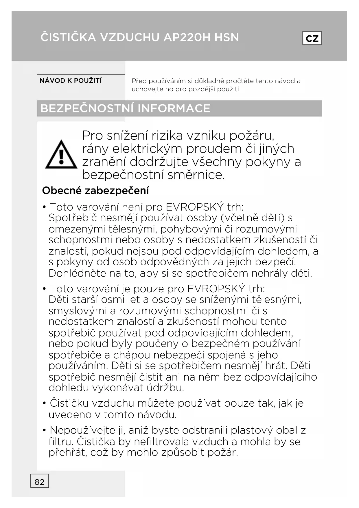 - Toto varování je pouze pro EVROPSKÝ trh: Děti starší osmi let a osoby se sníženými tělesnými, smyslovými a rozumovými schopnostmi či s nedostatkem znalostí a zkušeností mohou tento spotřebič používat pod odpovídajícím dohledem, nebo pokud byly poučeny o bezpečném používání spotřebiče a chápou nebezpečí spojená s jeho používáním. Děti si se spotřebičem nesmějí hrát. Děti spotřebič nesmějí čistit ani na něm bez odpovídajícího dohledu vykonávat údržbu.